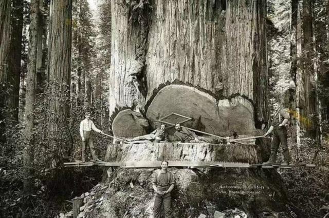 1891年,美国数十名伐木工,用了8天时间,砍倒了一棵100米高的千年红杉树,而