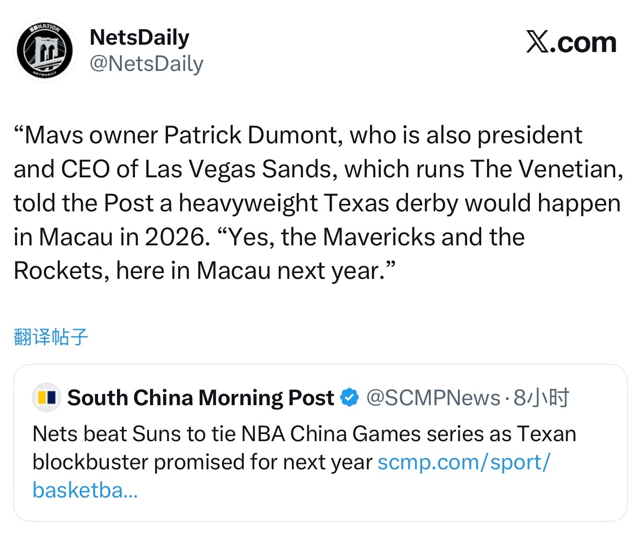 达拉斯独行侠队老板帕特里克·杜蒙向《华盛顿邮报》确认,2026年将在澳门举办一场重磅德州德比:"是的,独行侠与火箭明年将在澳门交锋。"