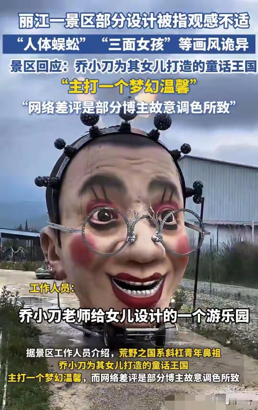 云南丽江的一景区内,里面的作品造型是民间艺术家乔小刀精心打造的,主要是为他女儿设计的童话王国!梦幻温馨的风格! 作品包括“人体蜈蚣”“三面女孩”等等!都是用很多回收的材料拼接而成的,人体蜈蚣的爪爪看上去很像小手! 画风看上去着实有点奇怪!有去过的网友在评论区里留言说:最好不要带孩子去,大人看了之后都有点不适感! 景区的工作人员也表示:是网友故意调成那样的色调,如果要是过去玩的话,尽量选择晴天,色彩就会显得温馨一些! 仔细看看,确实不是色调的问题,是因为设计风格太过独特!个人感觉有点恐怖,带孩子去的话还是要慎行!