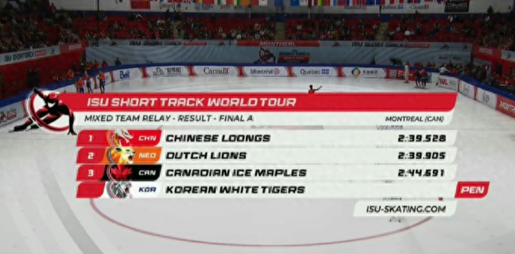 短道速滑世界巡回赛蒙特利尔站,2000米混合接力A组决赛,中国队派出孙龙、刘少昂