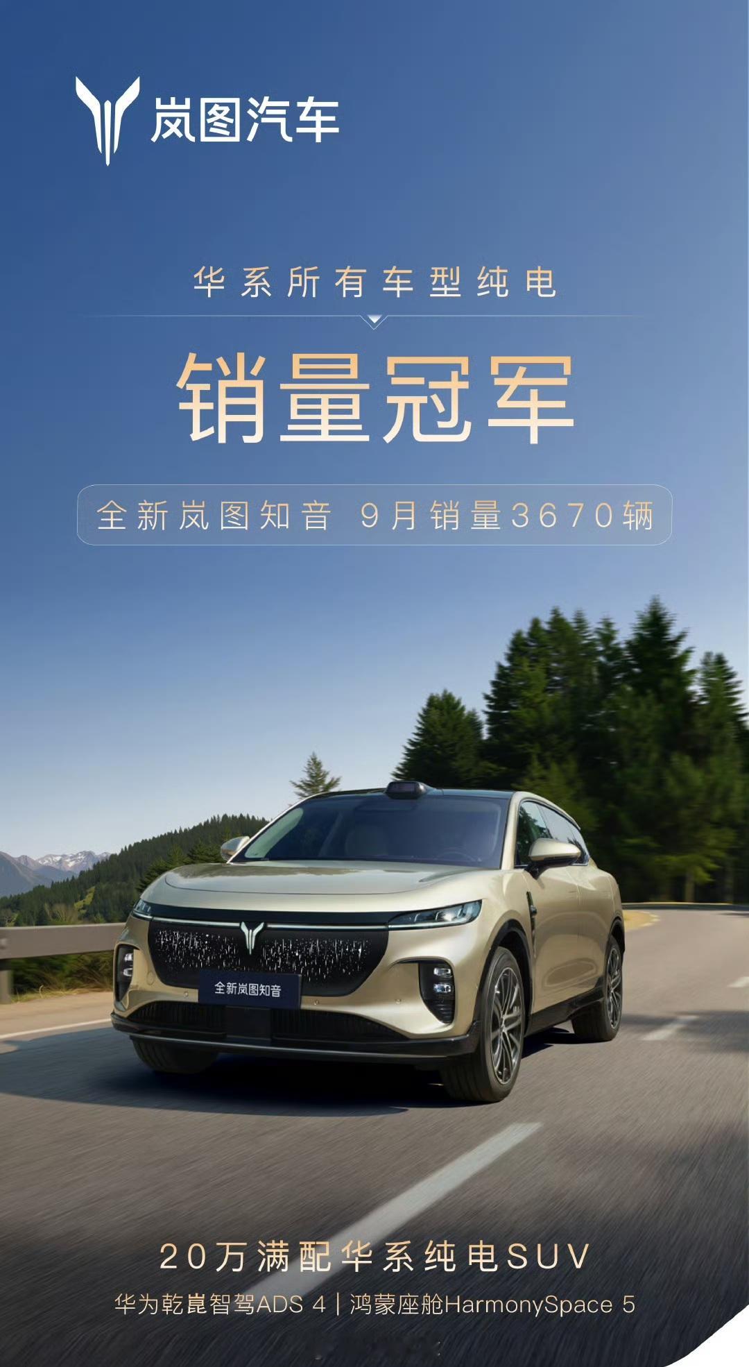 岚图宣布全新岚图知音 9 月卖了 3,670 辆,是华系所有车型中的纯电销量冠军。