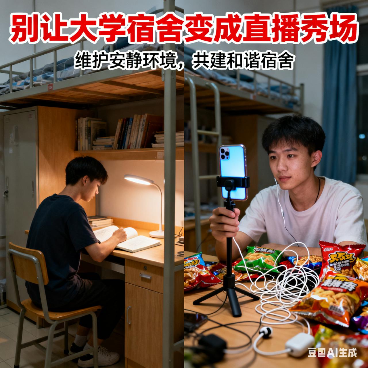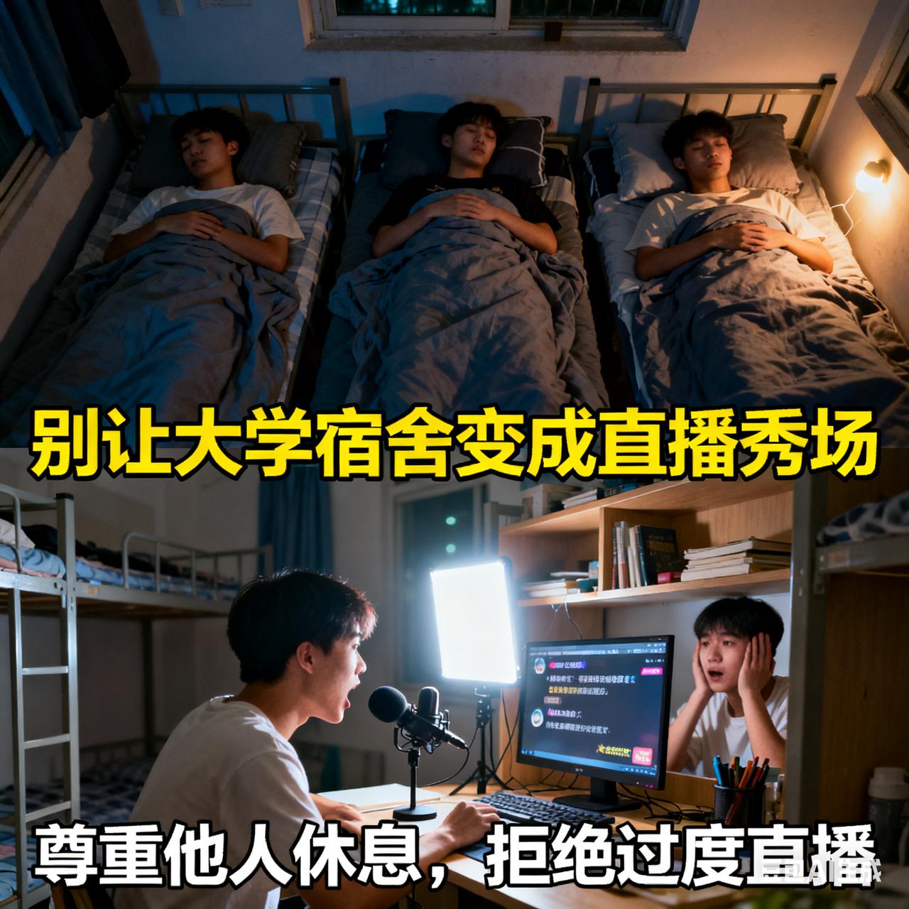 2025年开学季刚过一个月,社交媒体上对“室友直播”的吐槽就铺天盖地。现在,大学生在宿舍直播越来越常见,可很多主播不分场合、不分音量、不分昼夜地播,严重干扰他人休息,让舍友关系变得紧张。 为啥这么多大学生涌入直播赛道?一方面,大学时大家渴望被认可,直播能提供即时反馈,宿舍又能呈现最本真的状态,自然成了直播首选地。另一方面,部分头部主播“一夜爆红”“日进斗金”,让大学生觉得直播轻松自由,纷纷试水。但有些大学生直播存在不当行为,甚至还有低俗直播。大学宿舍不该成为直播秀场,大家得守住边界,别侵犯他人权益。