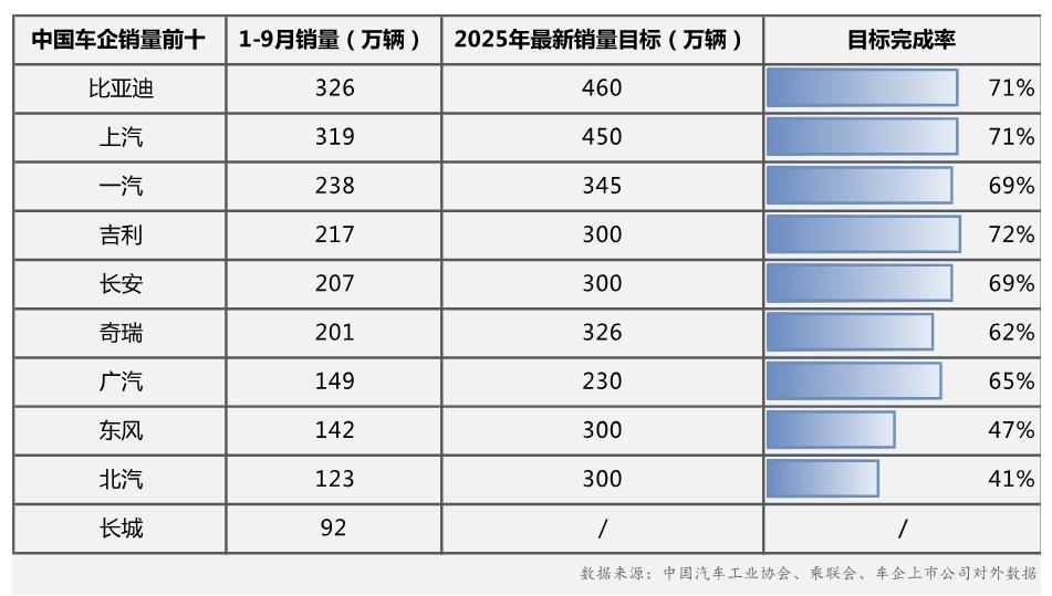 冲刺战打响!多家车企销量目标达成率亮眼。 在“金九银十”销售旺季推动下,2025年前三季度中国车市整体稳中向好,新能源渗透率持续高位运行,多家车企销量目标达成率亮眼。行业头部企业表现突出,比亚迪以326万辆销量实现71%的目标完成率,上汽集团也以319.3万辆达成71%。第二梯队中,吉利汽车以72%的完成率领跑,一汽、长安分别完成69%,奇瑞和广汽则达到62%和65%。 随着四季度关键冲刺期到来,企业体系能力与新能源转型成效将成为决定全年目标能否达成的关键,当前市场表现正成为检验车企综合实力的重要节点。