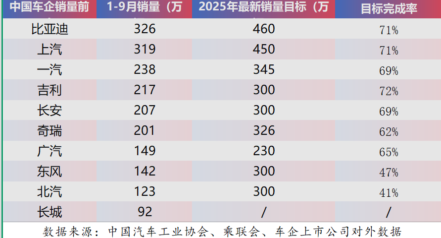 从数据来看,比亚迪1-9月累计销量达到326万辆,稳居榜首,完成全年460万辆目标的71%,依旧是那个熟悉的“卷王”,在新能源这条路上走得太稳了,几乎没给别人留什么空子,上汽集团紧随其后,累计销量319万辆,完成率同样71%,两家车企的策略虽不同,但都展现出强劲的增长势头。