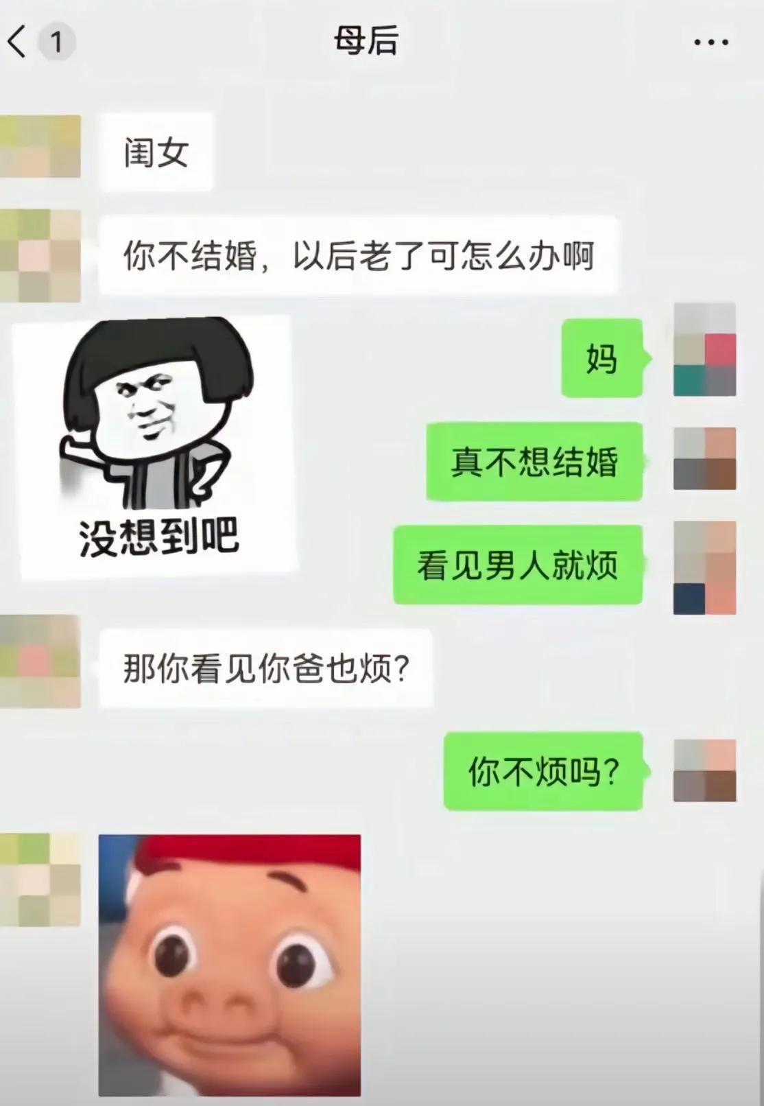 网上不结婚,网下玩疯了,最后玩不动了,老实人何在?速速备好房产,汽车,彩礼。看见男人就烦?怎么感觉男人越来越是弱势群体了。这就是当下社会“少部分”人的价值观,你们天天用这些去让你们的孩子看吗?既然这么觉得男人不好,那就离开啊……现在是当代社会,谁也不能要求男权、父权至上,但最基本的伦理道德不能没有吧。