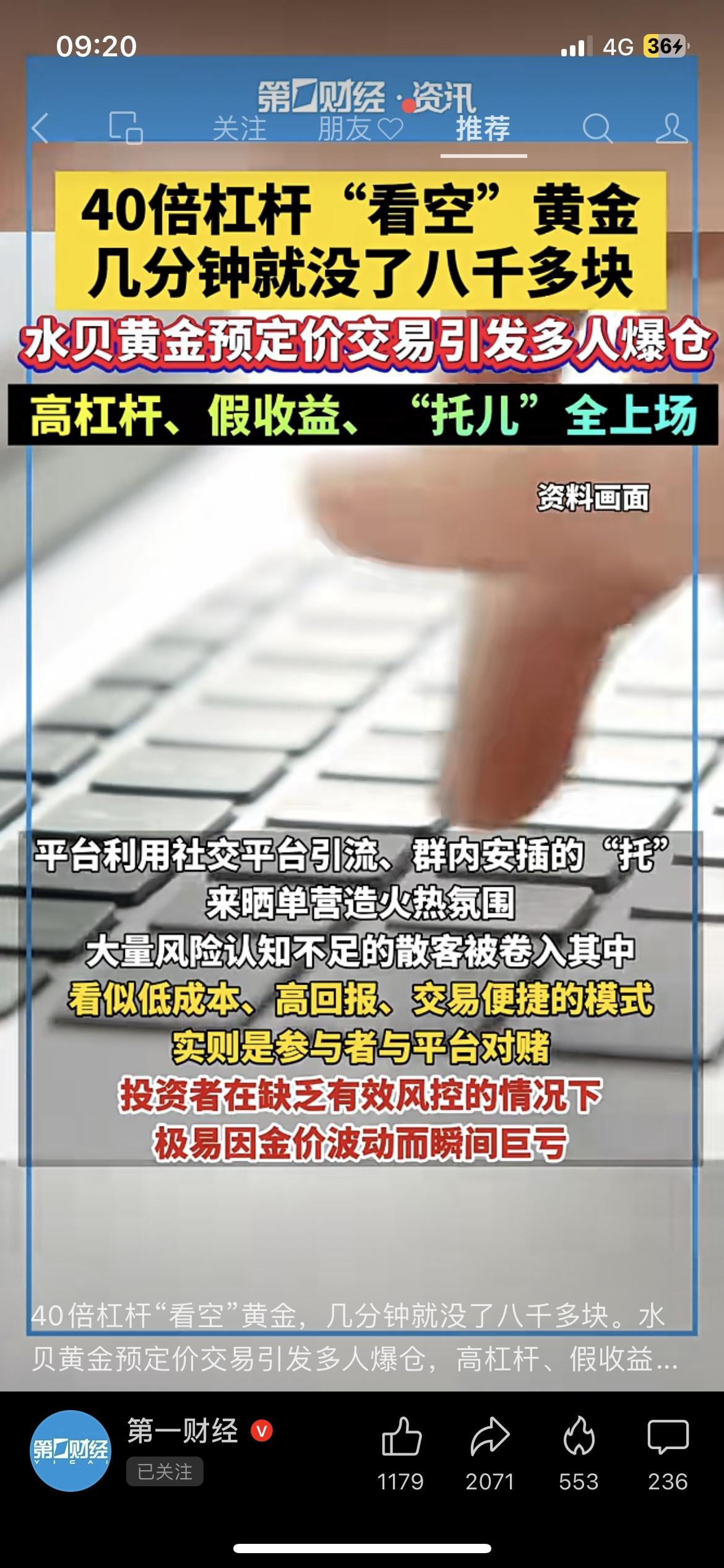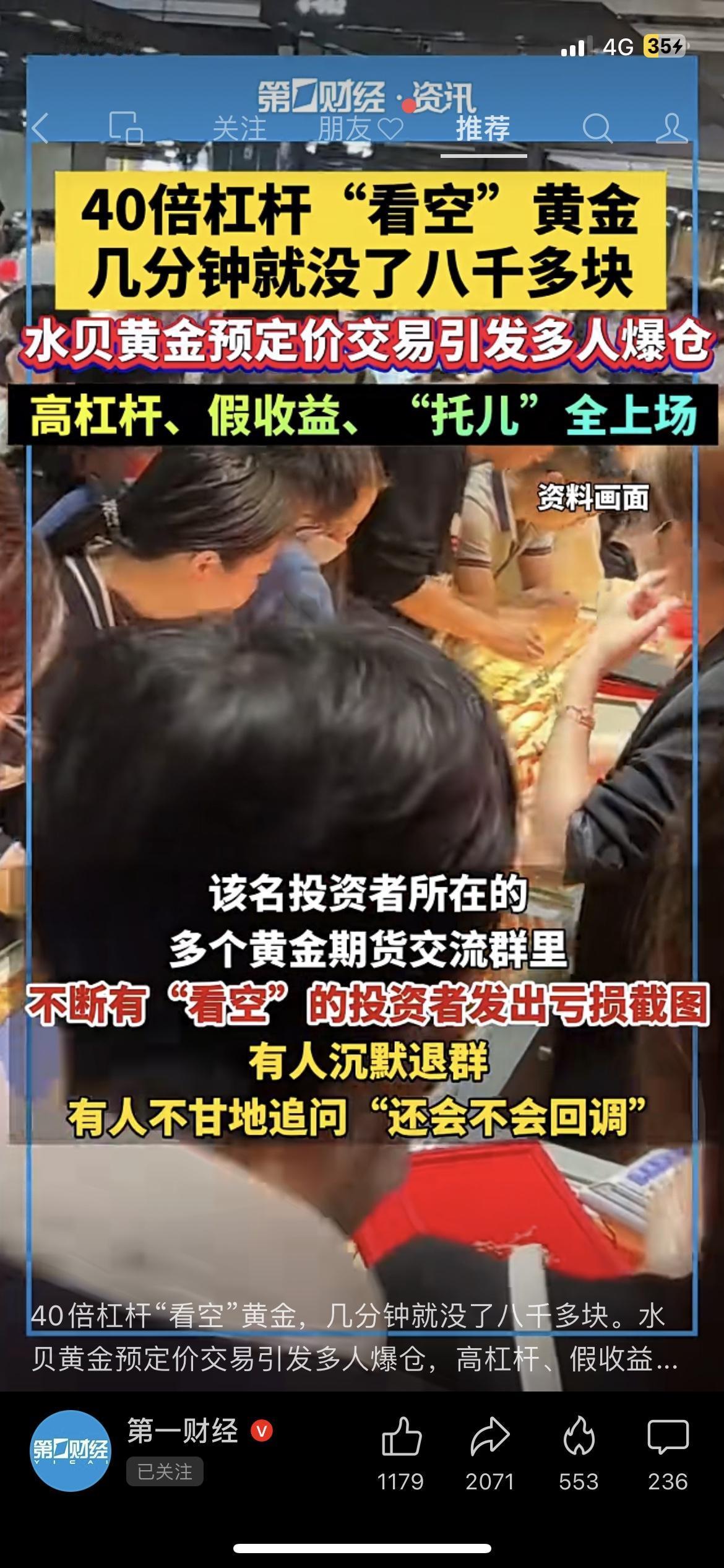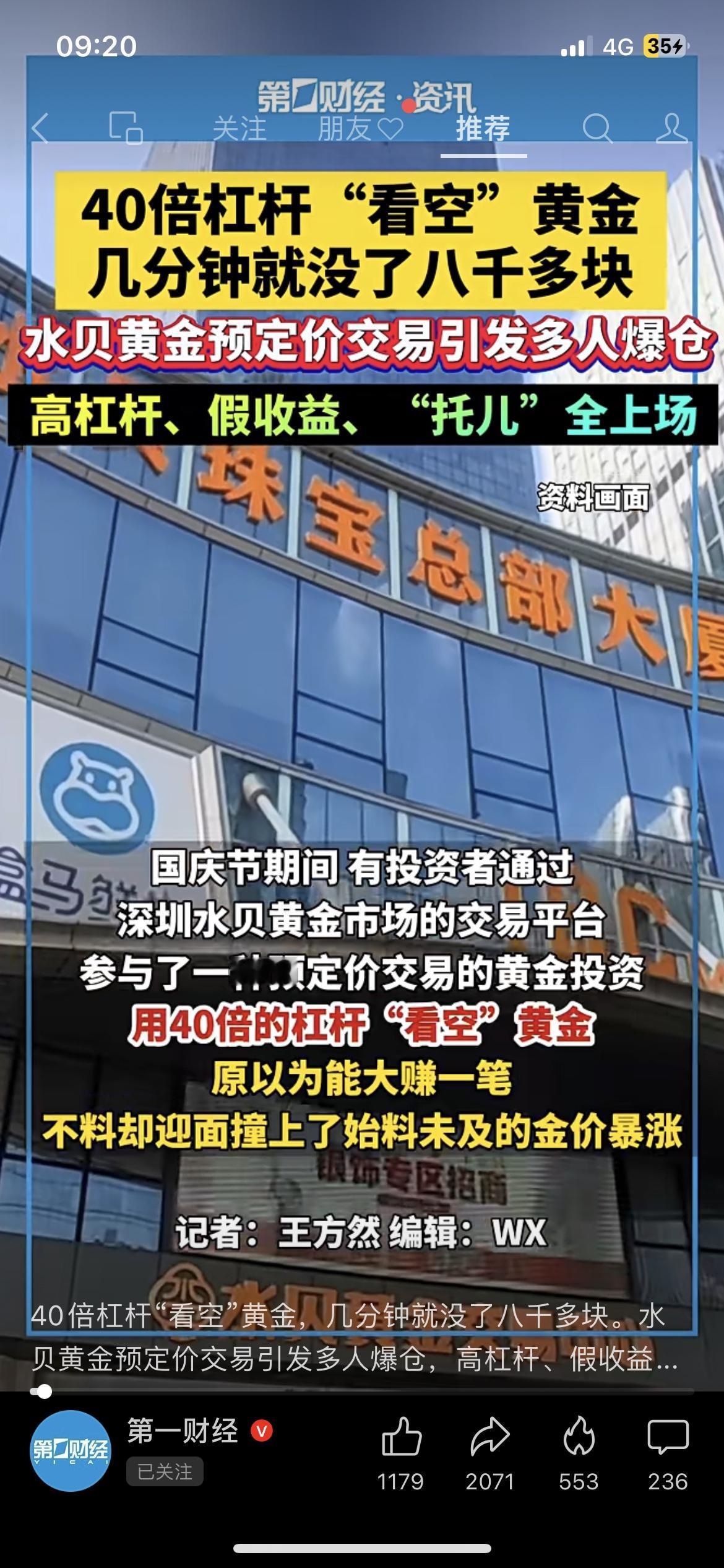 深圳水贝黄金40倍杠杆交易爆仓!多人几分钟亏八千,高杠杆陷阱要警惕深圳黄金按克卖 水贝黄金暴雷 国庆节有投资者玩黄金杠杆交易,40倍杠杆‘看空’黄金,结果几分钟就亏了八千多! 这事发生在深圳水贝黄金市场的预定价交易里,平台搞高杠杆,还有假收益、托儿在群里晒单引流。看起来低成本高回报,实际上是投资者跟平台对赌,金价一波动就容易爆仓。 咱普通人投资,这种高杠杆的坑真得躲远点。从这事能看出来,投资陷阱防不胜防,得先把风险想明白。 你有没有遇到过类似的投资陷阱?来评论区聊聊,给大家避避坑。 本文仅为市场信息解读,不构成任何投资建议,据此操作风险自担 A股热点 黄金投资风险