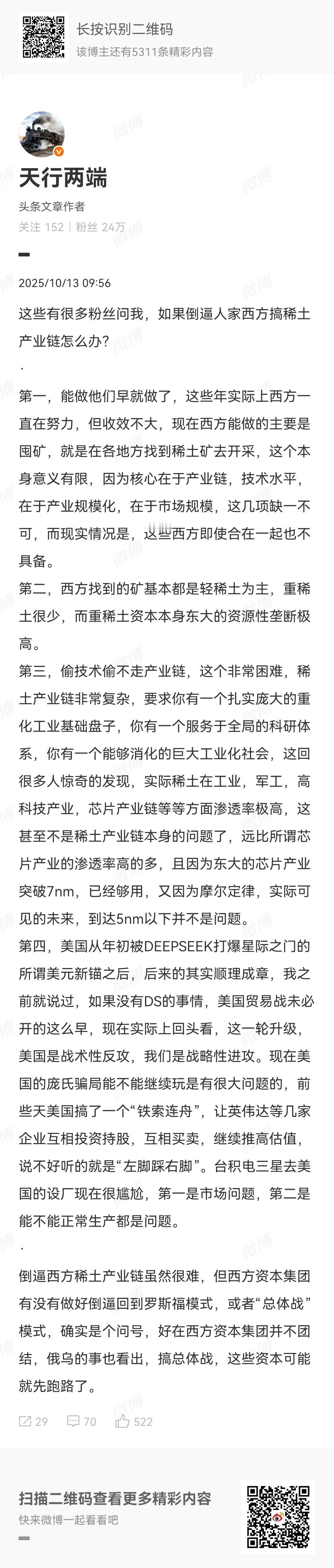 看完天行两端的这篇文章,才真正明白为什么美国不可能建造出一个稀土产业链。 首先是因为稀土矿。稀土矿分为轻稀土矿和重稀土矿,全世界只有中国拥有足够份量的重稀土矿,而美国的芯片产业、军事工业等等产业,需要的都是重稀土矿,在这方面我们拥有绝对的垄断性。 其次是因为稀土产业链非常庞大复杂。想要建造一个稀土产业链,需要一个扎实庞大的重化工业,需要一个庞大的科研队伍,需要一个能够消化这些工业产能的巨大市场,这几个都是目前美国所不具备的,毕竟美国已经去工业化很久了。 最后还有一个原因,是美国的组织力已经衰落了。现在的美国已经不是二战时期的美国,二战时期的美国,组织力非常强大,一个命令下去,就能轻松调动整个国家的力量,但现在美国处在一个两党对立、相互拆台的境地,不管做什么事情,都很难推动下去,加州高铁一直没能建造成功就是一个例子。 想要建造一个稀土产业链,强大的组织力不可或缺,但美国已经没有这样的力量了。 内外因素结合起来,使得美国根本没有任何可能建造一个稀土产业链,很多人都说美国花费三五年时间就能完成这件事情,实际上这不过是空想,现实很残酷,做不到就是做不到,美国主动在稀土这一块,会始终被我们卡脖子。