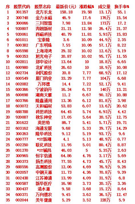 10月13日,MACD日线金叉的名单汇总 北方长龙:涨幅为19.58%,成交量为13.1万手。 金力永磁:涨幅为17.60%,成交量为176万手。 三川智慧:涨幅为13.84%,成交量为173万手。 奔朗新材:涨幅为12.58%,成交量为26.4万手。 西磁科技:涨幅为11.81%,成交量为5.93万手。 宝泰隆:涨幅为10.09%,成交量为44.9万手。