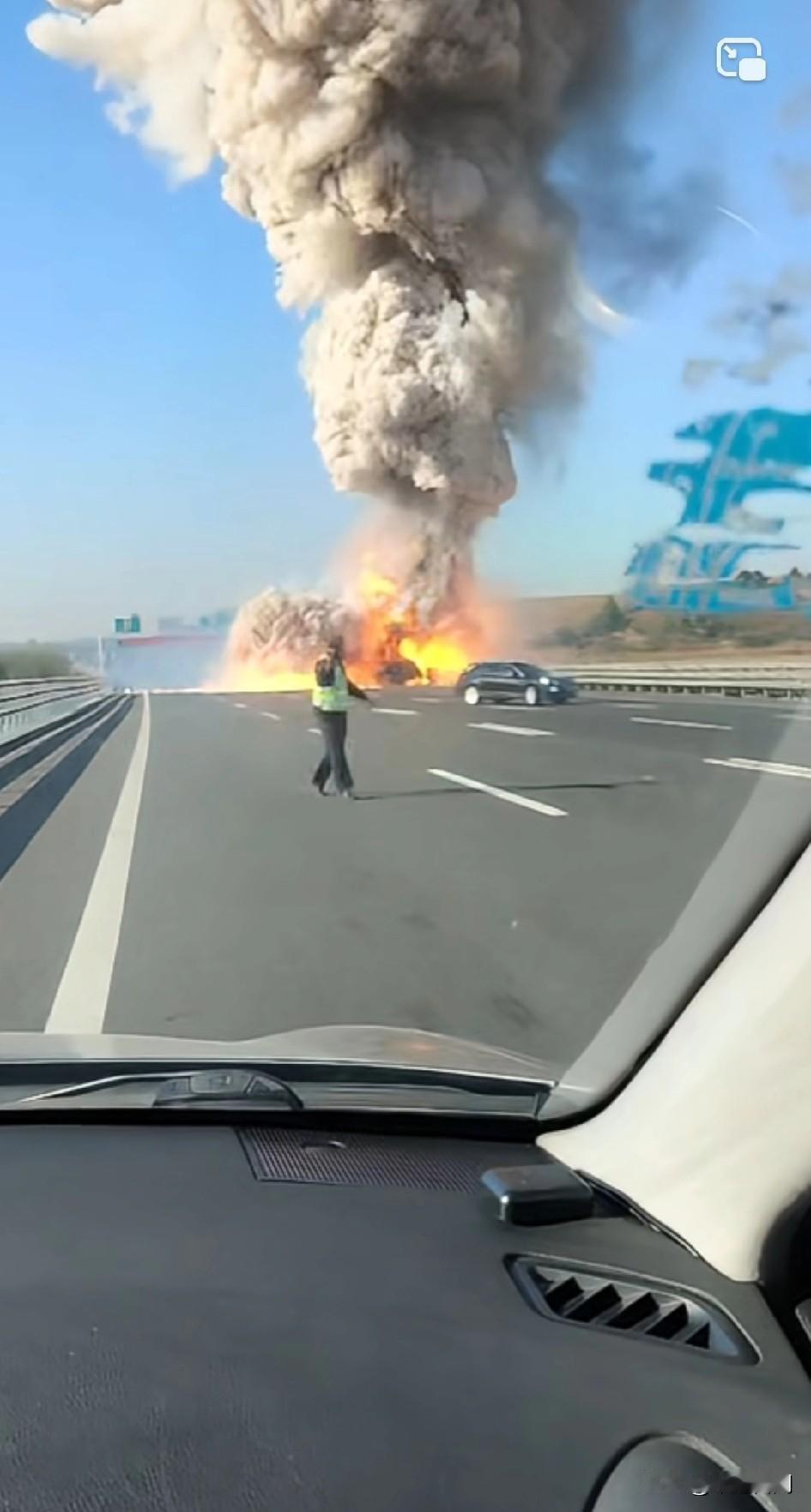 路上偶遇爆炸! 好像是汽车,连续爆炸两次,吓得前面黑色轿车拐回来了,冲击破太吓人了,还有蘑菇云,这是什么新能源汽车?我怀疑是新能源汽车,看不清,太远了,火光冲天真没错,皮卡萨拉的一顿炸! 希望车主跑了,离远点比较好。
