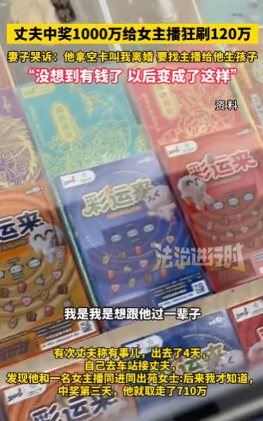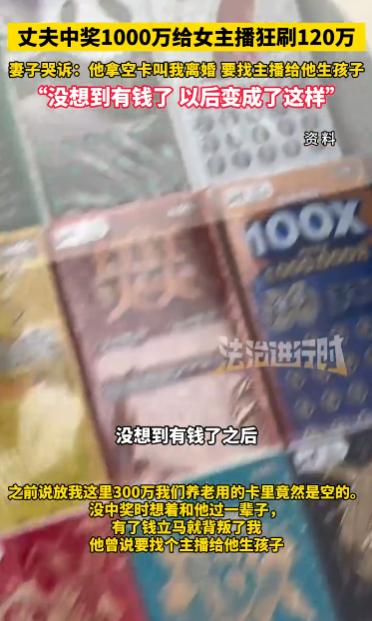 “电视都不敢这么演!”10月10日,山东德州,一男子买彩票中奖1000万,给女主播狂刷120万礼物,还拿着空卡要求妻子离婚,称自己要去找女主播给他生孩子,网友:男人一有钱就变坏啊! 意外之财是否能让一个人本性改变,这是一个颇具争议的话题,很多人认为这些变坏的人本性就是坏,只不过是钱让胆子变大了,展现出了真实的面目。 一男子酷爱买彩票,去年12月17日中了头奖,奖金高达1000多万,钱一拿到手,男子就开启了“挥金如土”模式,他大手一挥,直接给女主播刷了120万元的礼物。 中奖时男子口口声声跟妻子表示,留300万在卡里用作两人的养老金,结果才过去3天这笔钱就被他取了出来,和女主播一起外出旅游,同吃同住。 不仅如此,男子还拿着这张空卡要求发妻离婚,声称自己要去找漂亮的女主播给他生孩子,这让妻子伤心不已,没中奖之前妻子本打算和他过一辈子,没想到男子这一有钱,就背叛妻子自己快活去了。 不少网友认为这就是应了那句老话,男人一有钱就要变坏!其实这话并不准确,本性坏的人一旦条件变好了,自然就会露出自己的真实面目,况且照男子这个花法,估计这笔横财很快就会被他挥霍一空! 信息来源:《丈夫中奖1000万给女主播狂刷120万 妻子哭诉:他拿空卡叫我离婚 要找主播给他生孩子“没想到有钱了 以后变成了这样》法治进行时