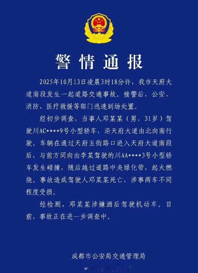 警方通报小米成都车祸酒后驾车,害人害己。