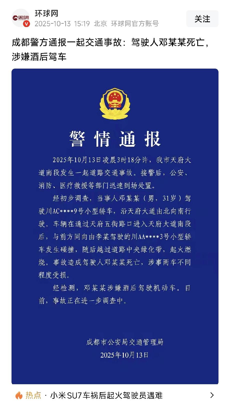 成都小米汽车起火通报来了 不出意外的还是出意外了 经过检测,驾驶员邓某某果然还是