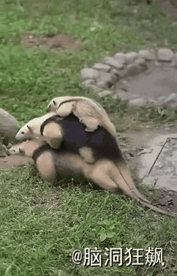 食蚁兽妈妈背娃累了,一看到孩儿它爸,立马“甩锅”爬孩儿它爸背上去了。果然,这个家