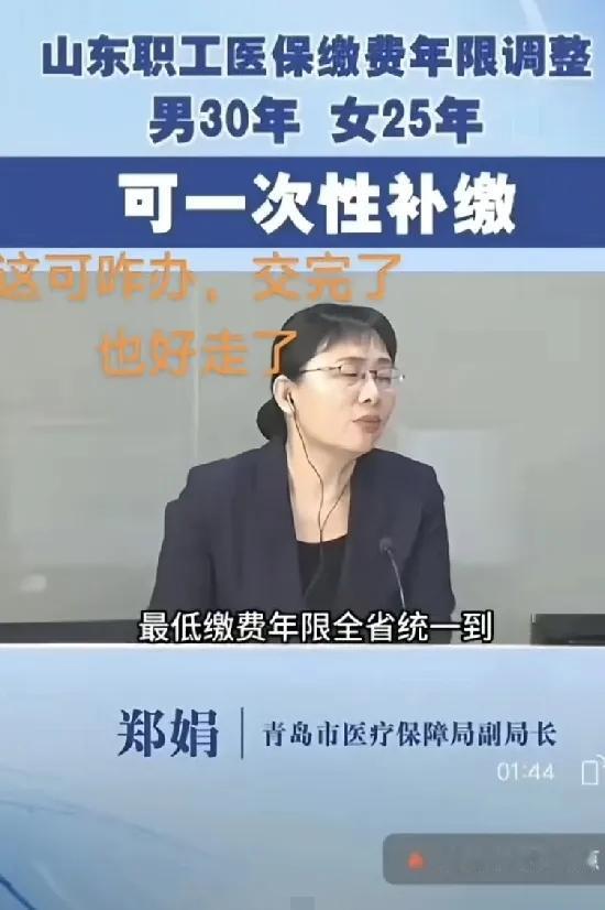 好客山东率先打响第一枪! 职工医保年限直接上调,男要缴满30年,女25年才能享退休待遇,26年1月就实施。 没缴够的能一次性补,也能按月续,这点还算人性化。但这调整明显是个信号,其他省份估计近几年都会跟上,统一成这个标准。 其实这是为了医保池可持续,但对快退休的人来说得赶紧算算账了,你们觉得这调整合理吗?