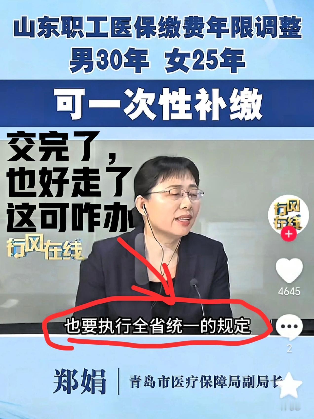 山东新规: 男性要满30年 女性要满25年, 才能“解锁”退休医保!你慌不慌? “第一枪”真的响了!山东官宣:2026年1月1日起,职工医保退休待遇门槛拉高——男30年、女25年,差一天都刷不开报销大门。 政策也留了两条活路:①一次性补缴,钱包大出血;②继续按月交,交满为止,相当于延迟退休PLUS。 算笔账:按最低基数4000元、单位+个人约10%比例,补30年≈14万,一辆车钱没了。 更扎心的是,山东打样,全国跟风是大概率事件。广东、浙江已吹风“拉长缴费”,医保全国联网后,年限统一就像共享单车涨价,一地试点,全国复制。 医保本质就是“众筹抗大病”,缴费期拉长,池子更稳,但对80后、90后自由职业者简直是暴击,既要自己扛社保,又要养娃还房贷,现在还得再交10年。 不交?往后住院费自己扛,分分钟回到“因病返贫”。年轻时不交,年老后“自费全麻”。 各位还差几年?准备一次性割肉还是慢慢续命?评论区聊聊
