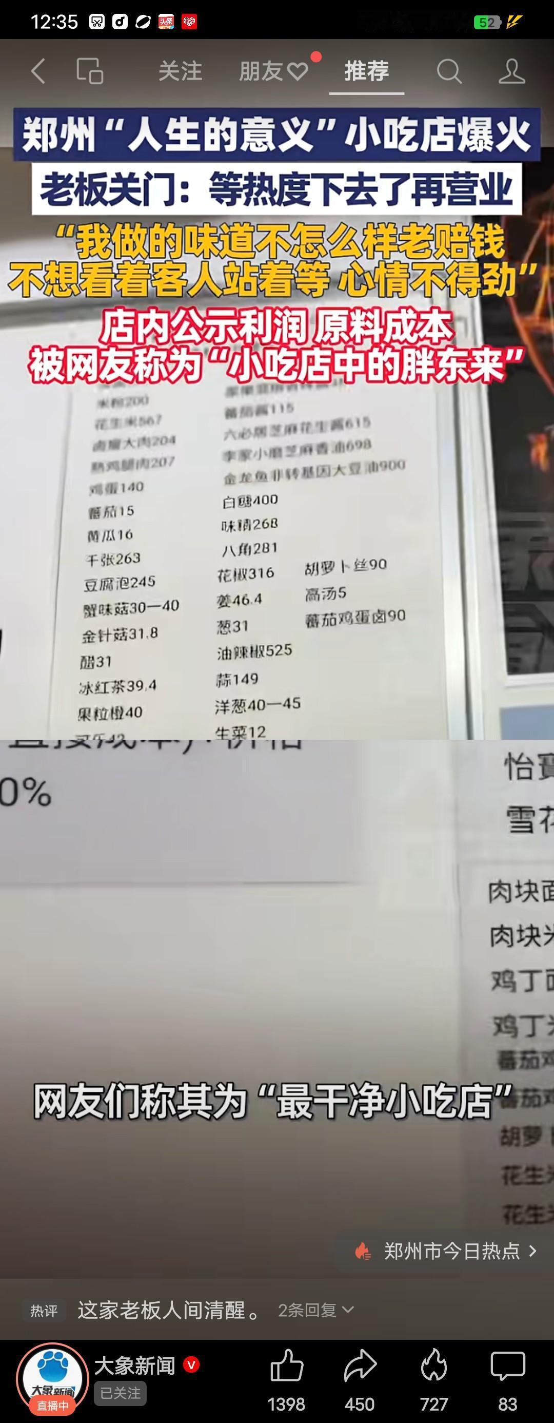 这绝对是这世间的一股清流! 又是河南郑州,这次小吃店老板不是蹭流量,而是要等热度下去了再营业。 最近河南郑州一家(人生的意义)小吃店在网上爆火,网友称是最干净的小店,店内公示利润,原料成本。然而在十月九号假期刚结束,小吃店就闭门歇业,一张告示是这样写的:本店暂时歇几天,等热度下去再营业,我不想蹭热度。 该小店只有三张桌子,十三平方米,店主张海峰说:我不想做网红店,我做的面味道也不怎么好,还老赔钱,我也不想关门,店里就三张桌子,坐满了就有人站着,看着他们站着我心里就说不清楚了,休息几天再营业。 有人说,这店的名字起的真好(人生意义)我们所有人都搞不清楚这人生的意义是什么。有人说,这绝对是这世上的一股清流,你看有多少人费劲心思蹭流量,谁会想到有人竟然要等热度下去才开业的,也有人拍掌称赞,这位仁兄就是人间最清醒的那个,这才是最长久的经营之道,这样的小店如果也能倒闭好像天理不容了!