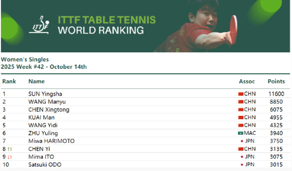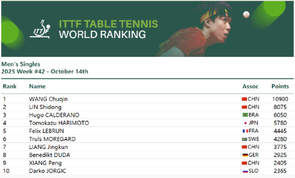10月14日,国际乒联更新2025年第42周世界排名 女单方面,孙颖莎 11600分连续第170周霸榜第一,王曼昱 8850分排名第二,陈幸同6075分排名第三。 男单方面,王楚钦 10900分排名第一,林詩棟 8075分排名第二,雨果6050分排名第三。 一起为国乒加油!