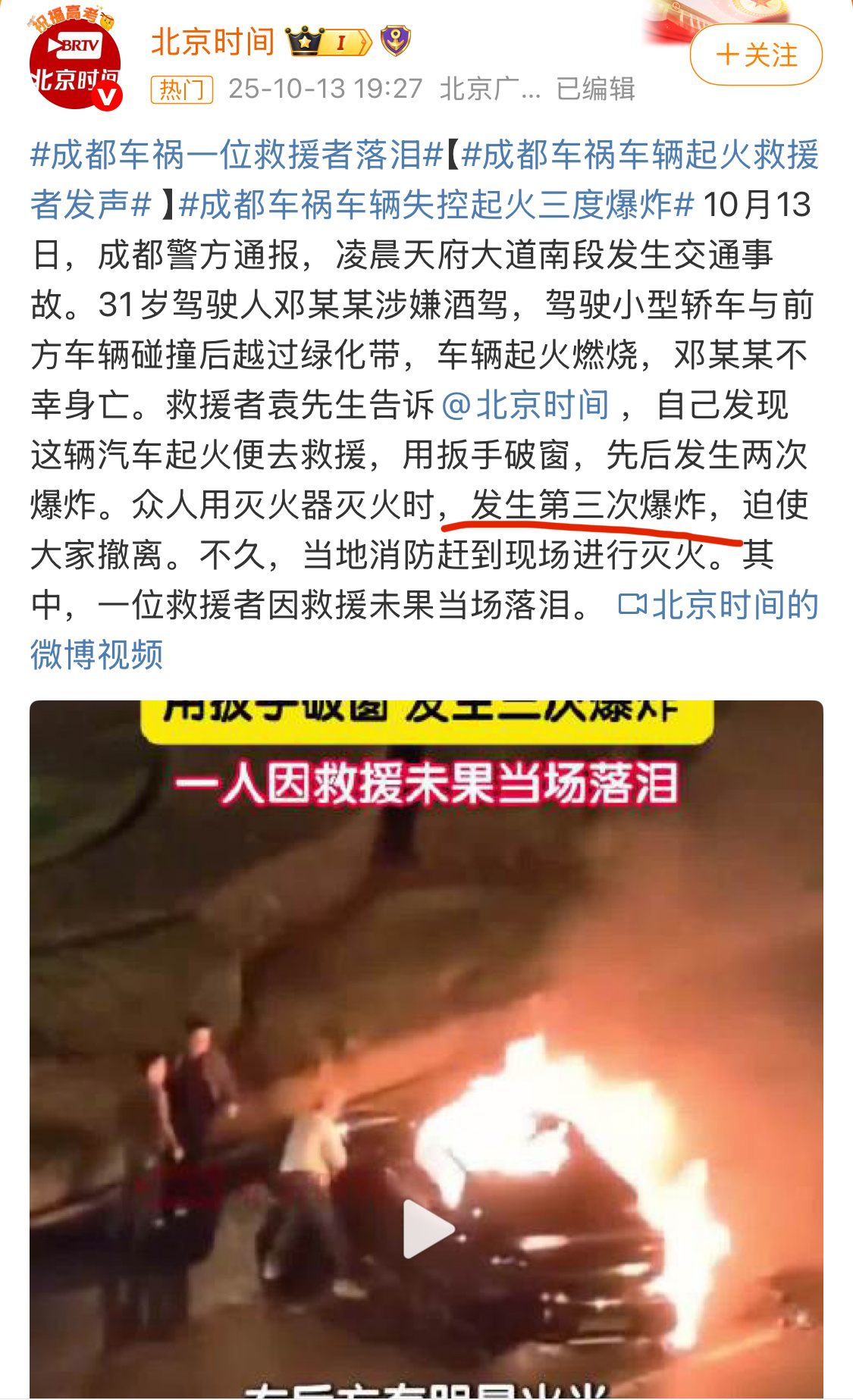 成都车祸车辆失控起火三度爆炸小米 又有媒体更新报道,出事车辆发生过三次爆炸,不得不说第一时间参与救援的路人,太勇敢了。所以车门拉不开到底是什么原因?等一下后续吧。