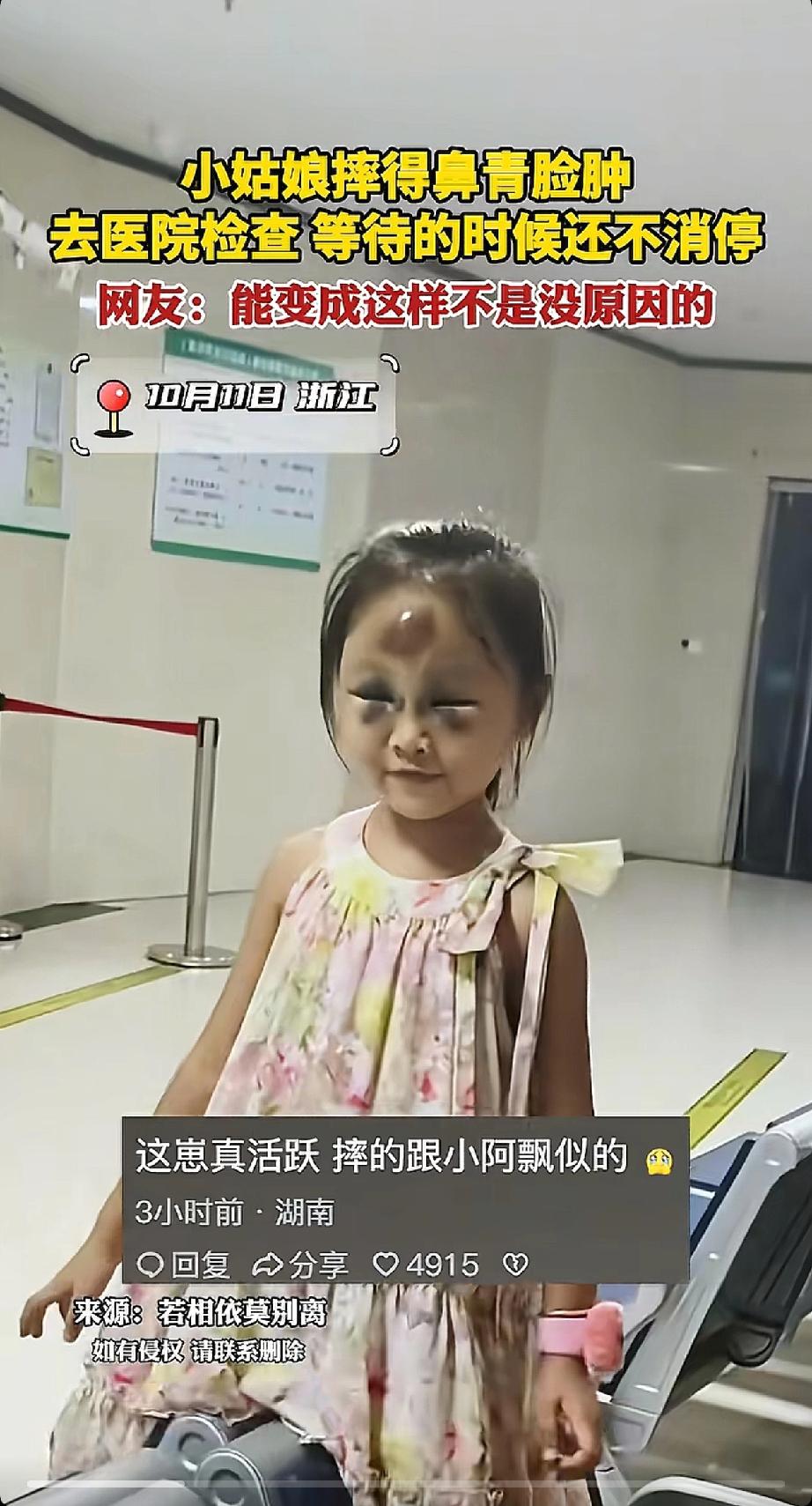 浙江那娃子太逗了, 摔得鼻子眼睛都肿成“烟熏妆”, 去医院排队还在 椅子上蹦跶,活力满得都要溢出来,哪像刚受了伤的样子? 网友都说她皮实,还有人调侃这“妆效”够特别,可我觉得这不是调皮, 是孩子最纯粹的生命力啊!他们的世界里,疼是一阵儿的, 当下的快乐才最要紧,哪会像大人似的纠结伤口好不好看、疼不疼。 不过话说回来,活泼归活泼,家长还是得多提个醒。 毕竟孩子没轻重,万一摔在关键地方就麻烦了, 教他们保护自己,才能让这份活力一直安安全全的。 你小时候是不是也这样?摔疼了哭两声就忘,转头又疯玩去了?快来说说你童年的“勇敢瞬间”!