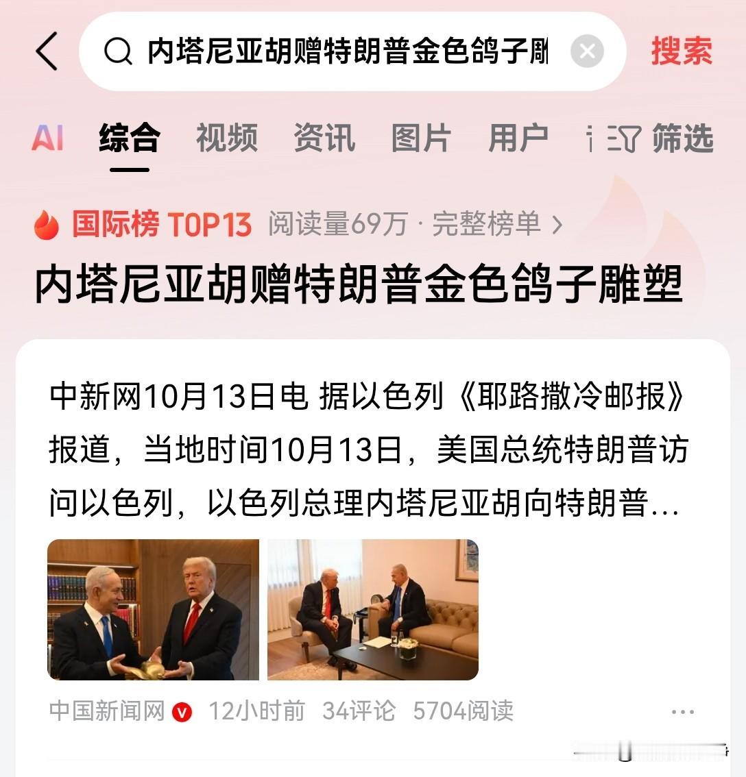 现在全世界都知道特朗普喜欢金子,同时也喜欢诺贝尔和平奖。 那么内塔尼亚胡就投其所好,直接送你一座金色的鸽子雕像。 但是新闻里并没有说这是镀金的还是纯金的。 看那个光泽不太像纯金的。 不会就是一座黄铜雕像吧? 以犹太人的性格是干得出来的,无奸不商嘛! 一整块金子送给特朗普,他们肯定舍不得。 弄个镀金的,凑合凑合也就得了! 内塔尼亚胡的潜台词就是你没有得到诺贝尔和平奖,不要伤心。 我给你补一只鸽子,而且还是金色的鸽子。 而特朗普当然是照单全收了。 不管是24k的,还是18k的,包括是镀金的,只要是金光闪闪的东西,他全都要!