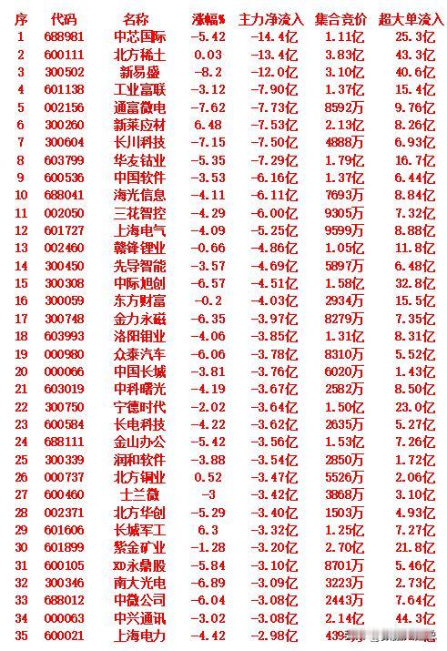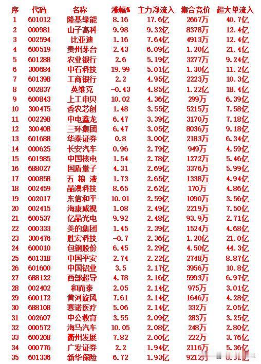 10月14日上午盘,主力趁低位,大幅买入的35名单: 隆基绿能:涨幅为8.16%,净流入17.6亿元。 山子高科:涨幅为9.98%,净流入9.32亿元。 比亚迪:涨幅为1.16%,净流入7.64亿元。 贵州茅台:涨幅为2.43%,净流入6.09亿元。 农业银行:涨幅为2.60%,净流入5.19亿元。 10月14日中午收盘,主力资金“大幅卖出”的35名单: 中芯国际(代码:688981):跌幅为5.42%,净流出14.4亿元。 北方稀土(代码:600111):微涨0.03%,净流出13.4亿元。 新易盛(代码:300502):跌幅为8.20%,净流出12.0亿元。 工业富联(代码:601138):跌幅为3.12%,净流出7.90亿元。 通富微电(代码:002156):跌幅为7.62%,净流出7.73亿元。