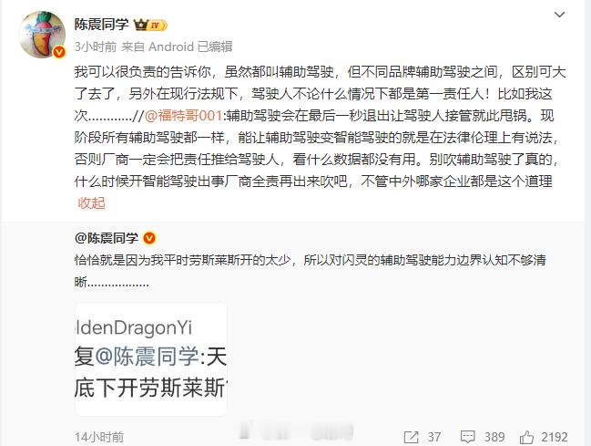 辅助驾驶不同品牌之家的差别确实有差异,经常关注我们第二届中国智驾大赛 的朋友在我们每月一期的中国智驾战力天梯榜 里安全榜里也可以感受到在安全策略上的不同,但目前在L2级辅助驾驶和现行法规之下,驾驶人什么情况下都是第一责任人,要随时关注并及时接管突发紧急状况
