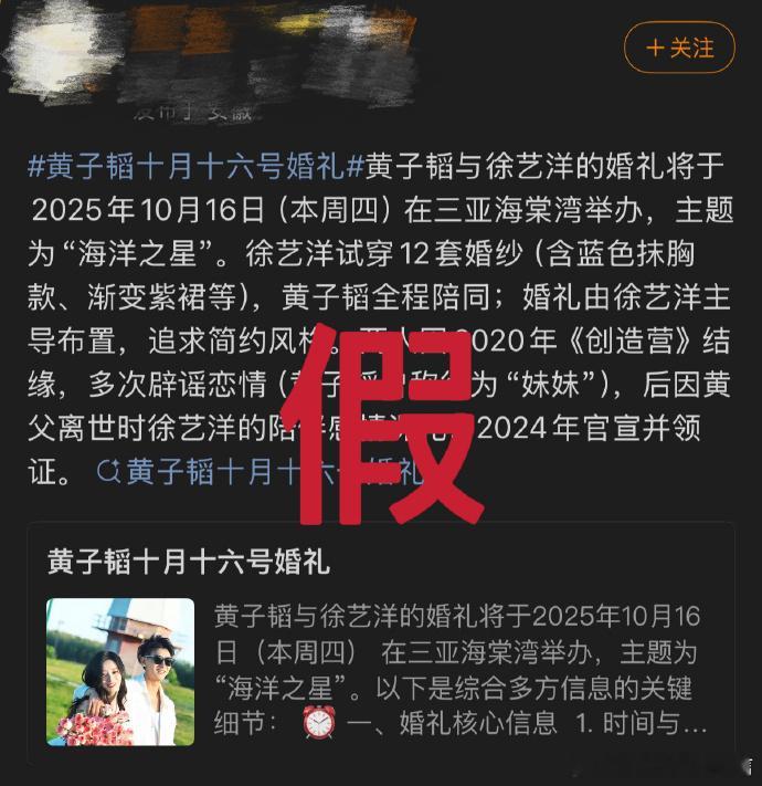 黄子韬工作室发文辟谣“世纪婚礼”一说,并称本次婚礼是纯私人、小范围的,外界无需过度关注。 ​ ​​​
