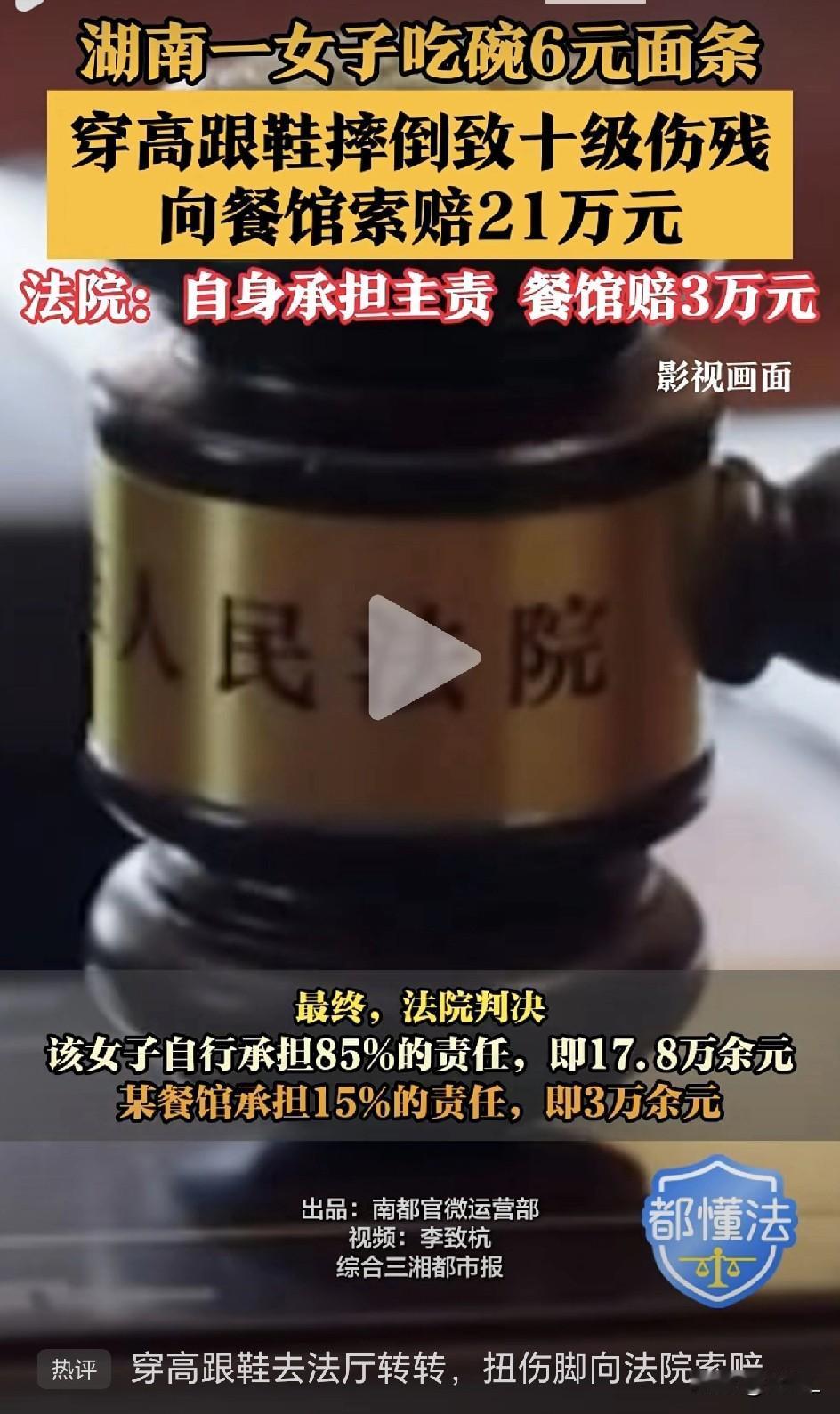 女子穿高跟鞋在餐馆摔伤获赔3万:我们正在活成一个不敢自己摔跤的社会! 近日,湖南岳阳,女子刘某在一家常去的餐馆点餐后,穿着高跟鞋返回座位。 却不想在店内玻璃推拉门的台阶处滑倒导致左髌骨骨折,经鉴定为十级伤残,需休养180天。她起诉餐馆索赔医疗费、护理费等共计21万元。 餐馆认为,刘某摔伤是因为她穿着高跟鞋,由于自身的疏忽而导致的意外,自己应该负全责。 刘某则认为餐馆在台阶衔接处防滑措施不足,有安全隐患,未尽安全保障义务,索赔21万。 法院判决结果,刘某作为成年人应可预见穿高跟鞋的风险,而且餐馆环境无异常湿滑或明显安全隐患,所以刘某负85%的主要责任。 而餐馆餐馆因台阶衔接处防滑措施不足承担15%责任(3万余元)。 评论区里一片哗然: “为什么不起诉地球的地心引力?如果不是地球的吸引力,摔倒了是可以直接漂浮在空中的。” “所有商家张贴告示:穿高跟鞋慎入!” “穿高跟鞋换个高档的餐厅,面馆小老板全副身家才多少钱?” “碰瓷之风已经弥漫到全社会了吗?” “高跟鞋生产厂家和销售店铺不承担部分必要责任吗?” “3万的赔偿,小面馆要卖几万面才能挣回来?” “以后干餐饮的,还是买上保险吧,不然遇到几个这样的,直接给干倒闭!” “以后餐馆都给高跟鞋们配双拖鞋吧,不换鞋不让进。” “为什么赔3万?一分钱都不应该赔!” 虽然网友们的话比较激进,但确实这个事让人意难平。 曾经假期带着孩子去某大峡谷旅行,进入地下大峡谷时,我发现台阶比较湿滑,所以走的小心翼翼,孩子拉着我的手,一直着急,觉着我走的太慢了。 就这样,我还是脚下一滑,一屁股坐在了台阶上。当场疼得我站不起来,也顾不上湿不湿、脏不脏的,在地上坐了半天,才慢慢起来。 因为人多,道路也是单向的,我只能忍着疼,慢慢随着人流往前走。 一路侧着身子坐车回了家,等着第二天,还是疼痛难忍,去医院一查,发现是尾骨骨裂。 坐不下,站不住,反正怎么都难受。 当时,压根没有想过向景区索赔这样的事。 地下大峡谷,肯定是湿滑的,走路肯定要小心翼翼,而滑倒是自己不小心,不然为啥那么多人都没滑倒。 回家治疗、请假休息,自己的责任自己背呗。 现在一旦发生意外,滑倒摔倒了,就在哪儿摔就告哪儿。有些家长,孩子跳楼了,不反省自己的责任,而是把物业告上法庭。 还有骑电动车撞了别人小汽车的,就觉着人家应该多多少少承担点责任。 自己的权益要维护,既得利益当争则争。但自己的错误,自己该担责也要担责。 我们似乎越来越无法接受“自己不小心”带来的后果,个人的风险意识正在退化,社会的包容心被无限透支。 当每一次摔倒都必须找到一个“负责方”,我们便活成了一个不敢自己摔跤的社会。 这个世界,不应该谁弱谁有理,更不应该谁声大谁有理! 信息来源于南方都市报,侵联删!