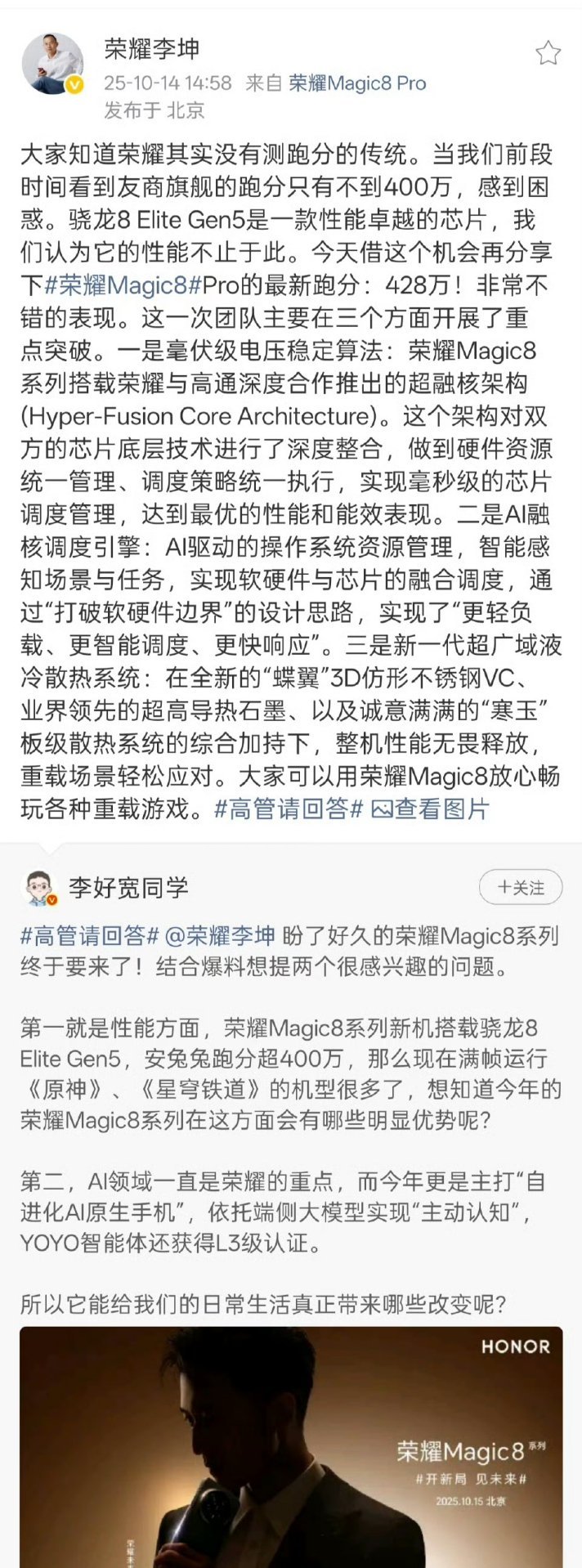 今年的荣耀真就主打一个听劝,今天荣耀产品线副总裁李坤还亲自答疑,而且非常有幸被翻牌了[春游家族]!