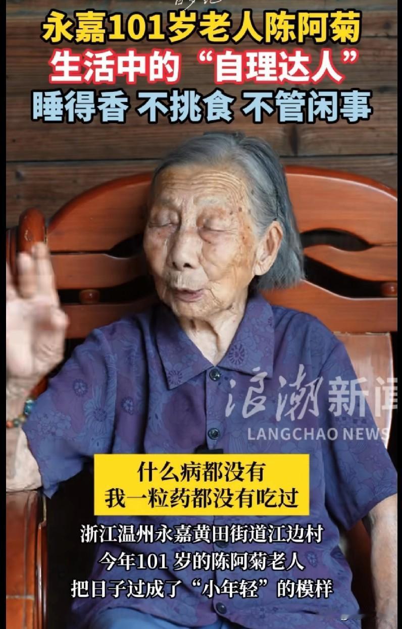 家人们快来看这位浙江永嘉的陈阿菊奶奶,101岁了还活得跟“小年轻”似的!啥病没有,一粒药没吃过,睡得香、不挑食,还不管闲事,妥妥的“自理达人”! 咱就说这心态和生活习惯绝了!年轻人熬夜吃外卖一堆亚健康,奶奶却把日子过得这么通透。人家的长寿秘诀就是“睡得香、不挑食、不管闲事”,这简单的道理,咱们咋就做不到呢😂 你们身边有这样的长寿老人不?快在评论区聊聊他们的“养生绝学”,咱也跟着取取经!治愈系老太