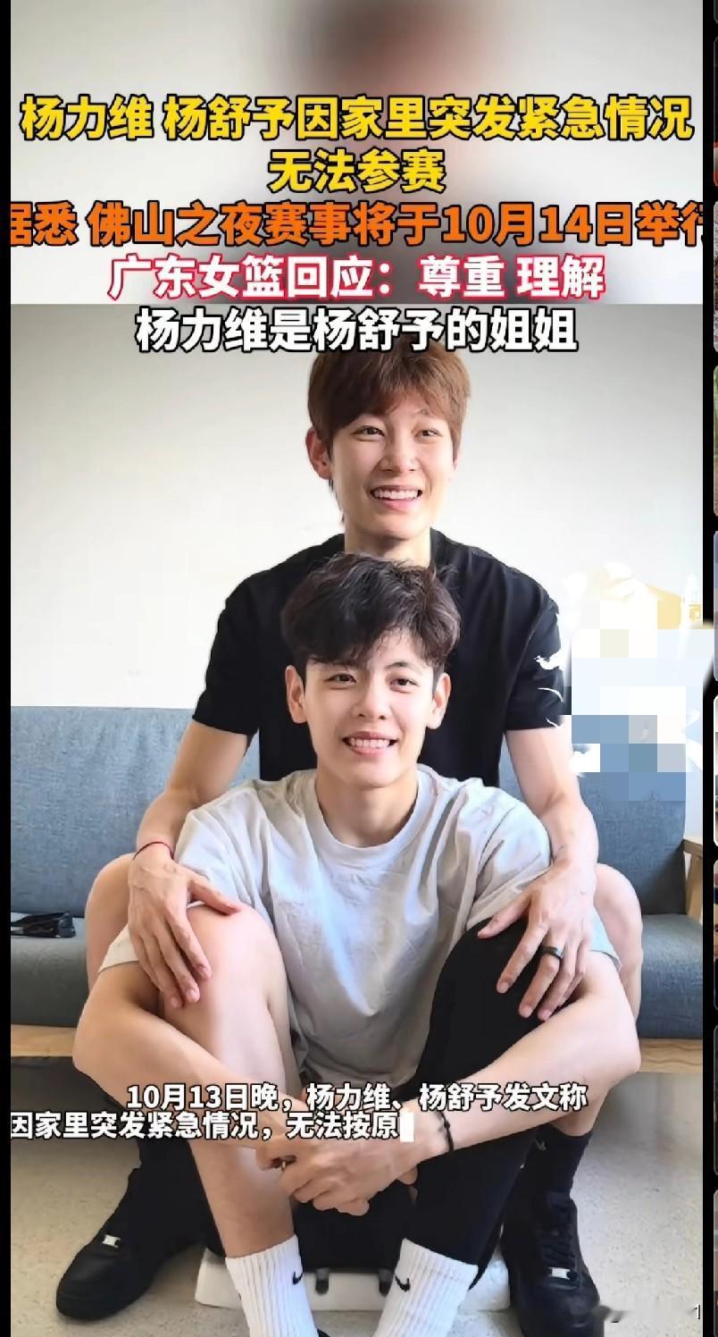 家人们,女篮姐妹花杨力维、杨舒予因为家里突发紧急情况,没法参加10月14日的佛山之夜赛事了。广东女篮也回应了,说尊重理解。 这姐妹俩在球场上那叫一个飒,突然因为家里事缺席,肯定也是迫不得已。咱普通人遇到家里急事也得先顾着家,更别说她们了。 希望姐妹俩家里的事能顺利解决,也期待她们后续能在赛场上继续发光发热。你们平时关注女篮吗?对这对姐妹花印象咋样?评论区聊聊~