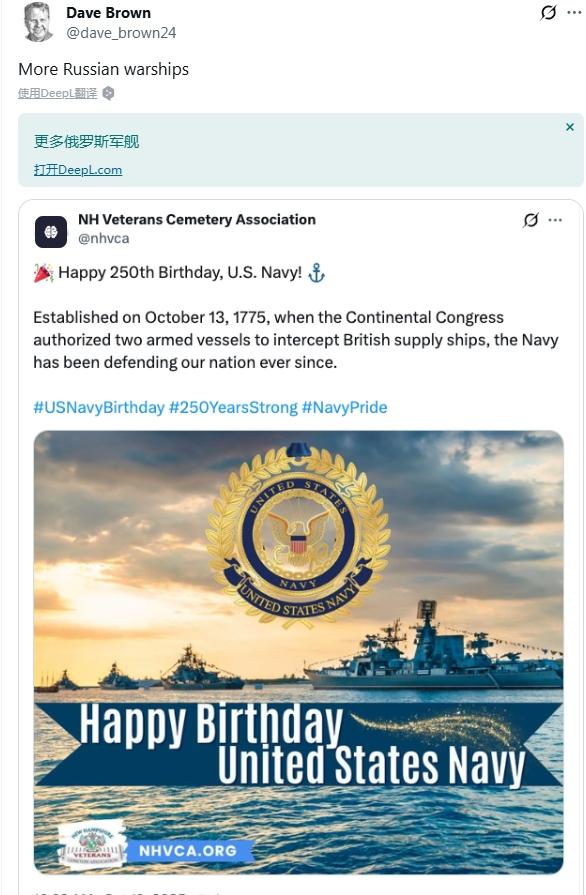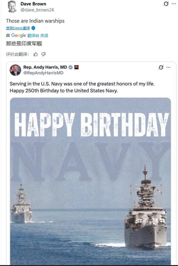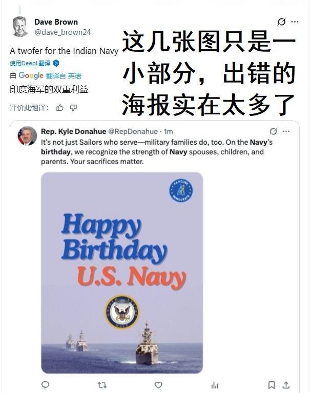 美国海军成立250周年,美宣闹250笑话 今年的10月13日是美国海军成立的第250周年,但这一天庆祝纪念日的美国政客、官方机构却闹出了大量宛如250一样的笑话。 直接用AI生产的“美军舰艇”图片还只是小问题,更奇葩的是,这帮给美国海军庆生的政客甚至是官方机构,居然连自家舰艇是什么样都不认识,比如一个自称为“新罕布什尔州退伍军人公墓协会”和“海豹突击队博物馆”的庆祝海报用的是俄罗斯舰艇。 而众议员凯尔·多纳休、安迪·哈里斯等政客倒是没用俄罗斯军舰,直接改用印度军舰,令收集这些笑话的《华尔街日报》副主编戴夫·布朗在社交媒体上疯狂吐槽…… 只能说,这个世界果然是一个巨大的草台班子。