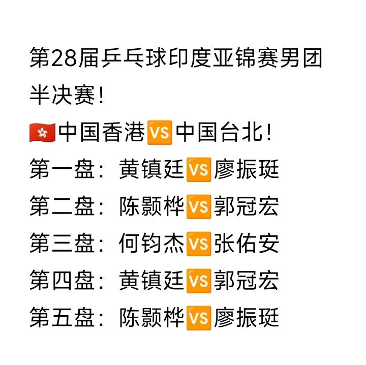 黄镇廷拿下第一盘! 第一盘,港队一单黄镇廷大战五局,3-2战胜中国台北选手廖振珽,为中国香港男团拿下关键的第一分! 五局比分为:11-4,8-11,11-7,10-12,11-8。 决胜局大圣被对手追分追得惊心动魄,还好局末大圣的两个发球挽救了局势。 这是一场第28届乒乓球印度亚锦赛男团半决赛,目前中国香港男团1-0领先中国台北男团, 第二盘:陈颢桦🆚郭冠宏! “锡纸烫”加油哦[笑哭]!