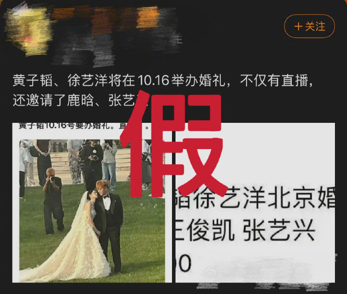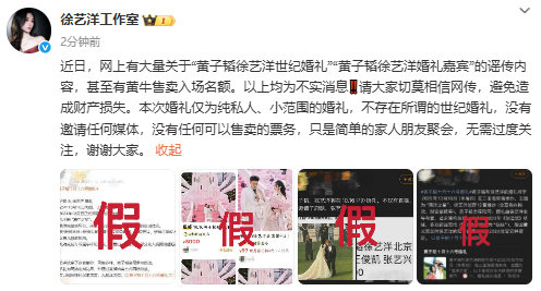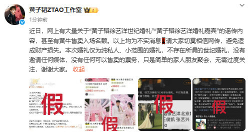 黄子韬徐艺洋方回应婚礼相关传闻 近日,网传黄子韬、徐艺洋婚礼嘉宾阵容和黄牛卖票名额。新浪娱乐独家求证黄子韬团队,团队回应称均为不实消息:此次婚礼为纯私人小范围婚礼,没有邀请任何媒体,更不会有任何外部名额,请大家切莫相信所谓的网传,避免造成财产损失。 ​​​​两人工作室也均发文打假。