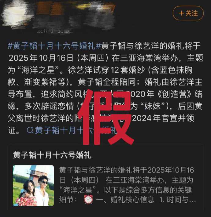 黄子韬徐艺洋方回应婚礼相关传闻近日,网传黄子韬、徐艺洋婚礼嘉宾阵容和黄牛卖票名