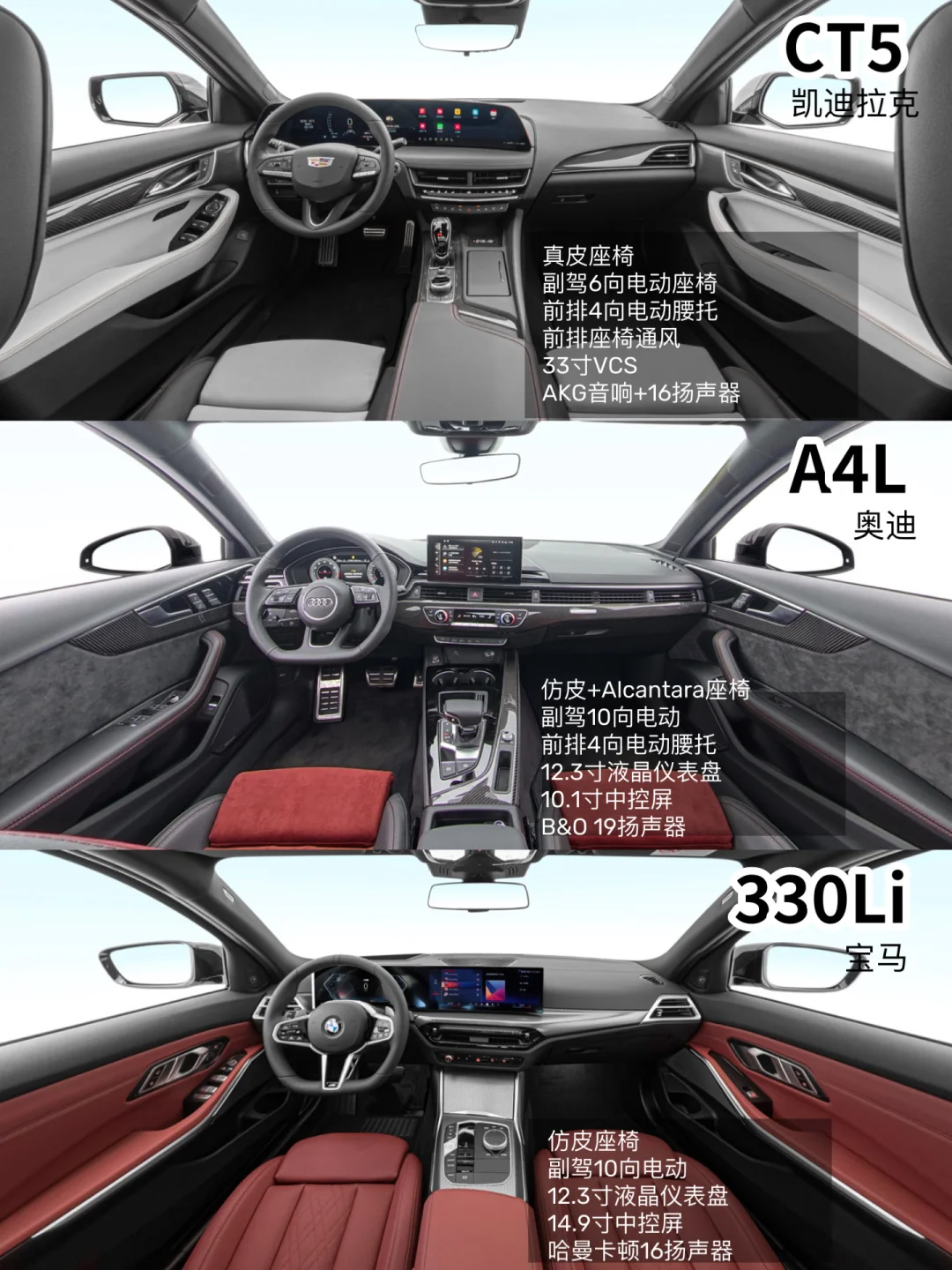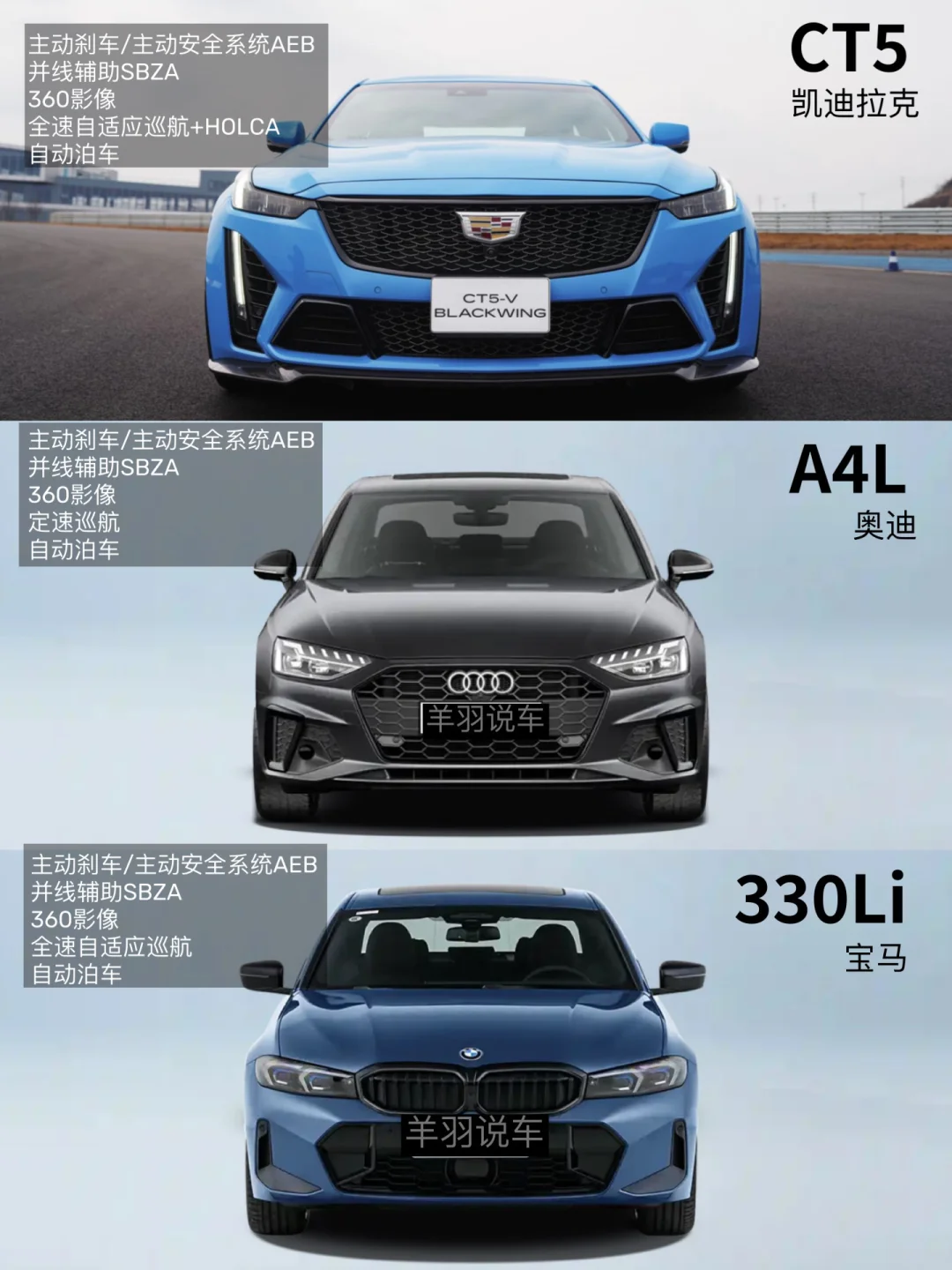 ✅配置方面,CT5赛道性能版有主动刹车、并线辅助、360影像、全速自适应巡航和自动泊车等,日常驾驶安全感满满。A4L和3系在舒适配置上也不错,但像CT5这样丰富且贴心的配置,还是少一些。比如说A4L可能在座椅调节的丰富度上就不如CT5,3系在氛围灯的色彩丰富度等方面也略逊一筹。