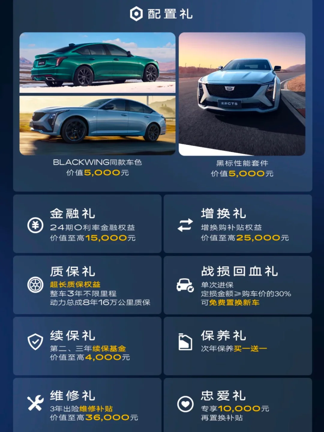 💰算账时间到:CT5赛道性能版全款一口价245,900元,没有花里胡哨的涨价,强制贷款。5年银行贷款减15000元,旧车置换减5000元,旧车为凯迪拉克减10000元,上牌可申省补/国补13000-15000元。还提供续保、保养等多重权益,含保费减免、质保、维修补贴等,战损置换必须单独说说,买运动类型的车多多少少会跑跑山,飙飙车等,不小心发生比较严重的剐蹭,这个也完全不用担心的,因为官方承诺了,如果3年内定损达到30%就能直接换新车!意思就是你随便开,坏了我赔你新的,官方给你兜底,是要对自己的车有多自信,才敢有的承诺呀!