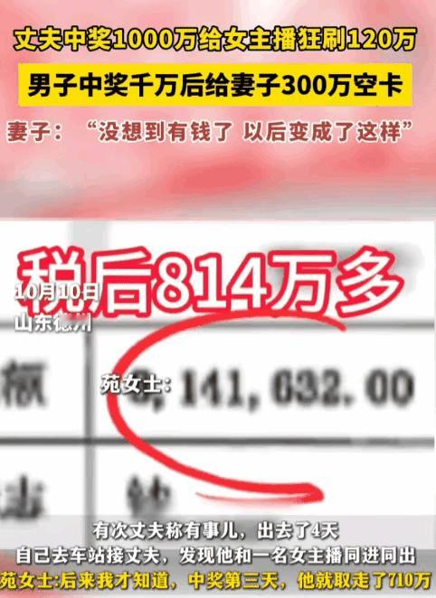 “男人有钱就变坏?山东德州,男子中了1017万大奖,到手814万,妻子高兴得不得了,心想两个人终于能好好过日子了,可没过多久,她就发现丈夫变心了。 据中吴网10月13日报道,一夜暴富,是穷人的解药,还是婚姻的毒药?山东德州一个普通家庭的经历,或许能给我们一个心碎的答案。 原本,这是一个再普通不过的家庭,夫妻俩过着省吃俭用的日子,最大的梦想或许就是生活能宽裕一些,直到一张小小的彩票,彻底改变了这一切。” 妻子原本想着,中奖能把漏雨的老房子翻新,给丈夫换辆电动车跑运输,自己也能添件新衣裳——日子苦点不怕,俩人手拉手总能熬出头。 可钱到账没仨月,丈夫开始整夜不回家,说“应酬多”;手机设了新密码,问就说“生意伙伴”;从前下工回家还帮她择菜,现在往沙发上一躺只顾刷手机。 她翻旧照片时掉眼泪,照片里俩人蹲在路边啃馒头,丈夫还说“等有钱了给你买蛋糕”,现在蛋糕有了,人却变了。 有人说“男人有钱就变坏”,可变坏的真的是钱吗?是丈夫打从骨子里就没把“一起过日子”当回事。 省吃俭用时他能共苦,有钱了就忘了同甘的承诺;从前知道妻子图个踏实,发达了就觉得“外面彩旗更艳”。钱只是面镜子,照出了他本来就有的贪心和薄情。 婚姻里最怕的,不是穷得揭不开锅,是富了就忘了根。俩人能穷的时候相濡以沫,富的时候更该守住心——钱是工具,不是目的。 日子要过成“我们”,不是“我有钱了你要听我的”。这位妻子的委屈,何尝不是替所有相信“共患难”的人委屈? 各位读者你们怎么看?欢迎在评论区讨论。