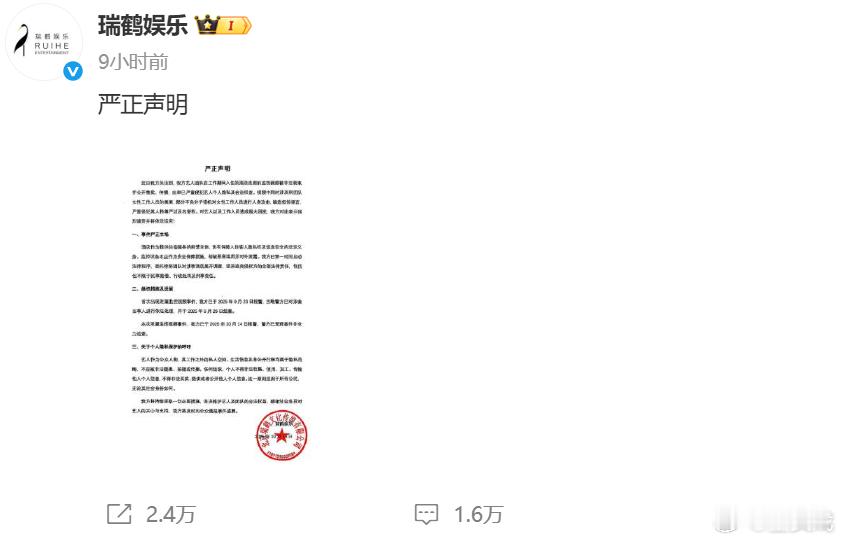 瑞鹤娱乐酒店事件严正声明 近日网络上曝出梓渝酒店监控视频,引热议。15日凌晨,发布严正声明,表示首次出现泄露监控视频事件时就已报警,并已于10月14日再次报警,将持续采取一切必要措施,坚决维护艺人及团队的合法权益。 ​​​​