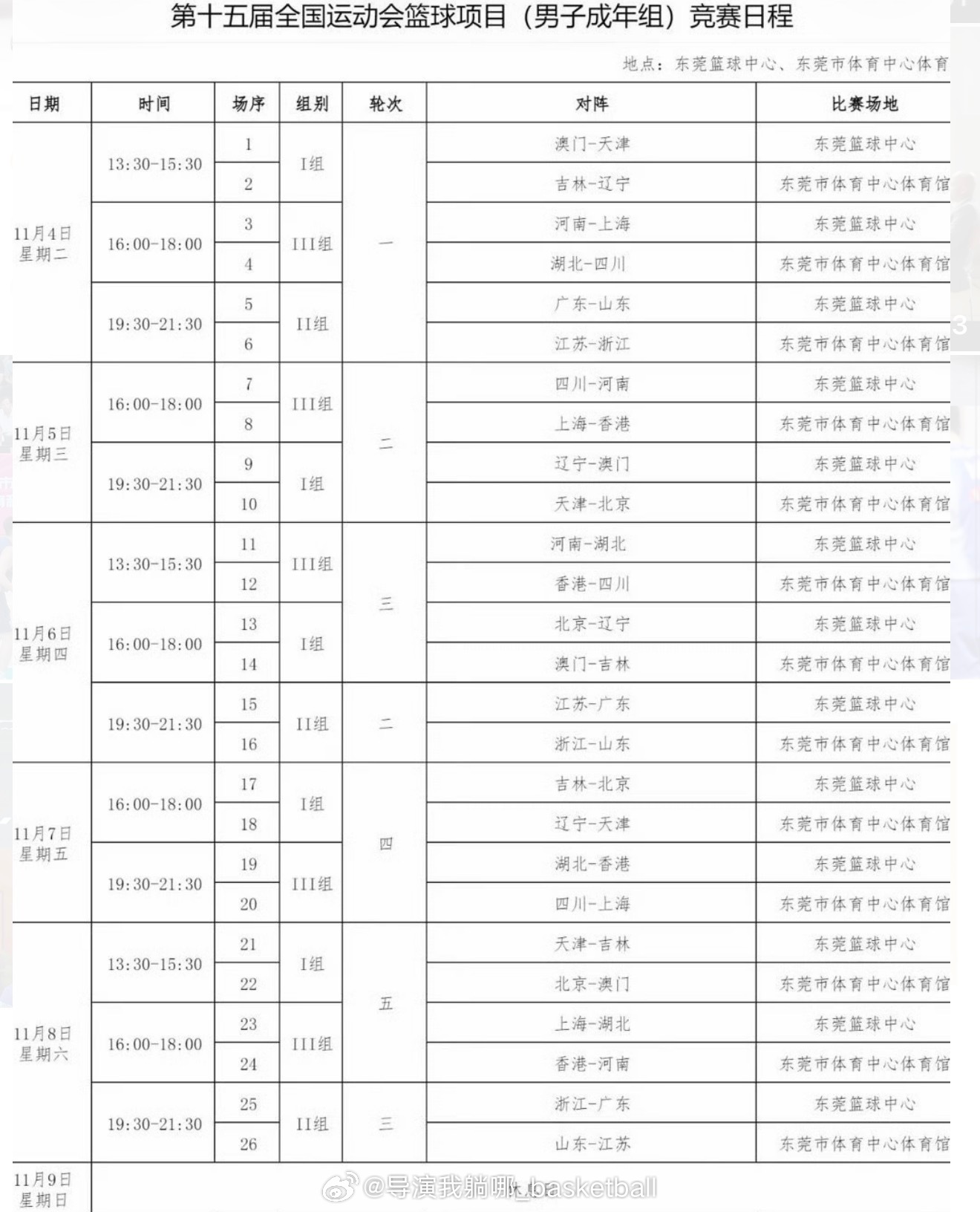 全运会男篮成年组赛程公布:11月4日开战,11月12日将上演金牌争夺战第十五届全运会