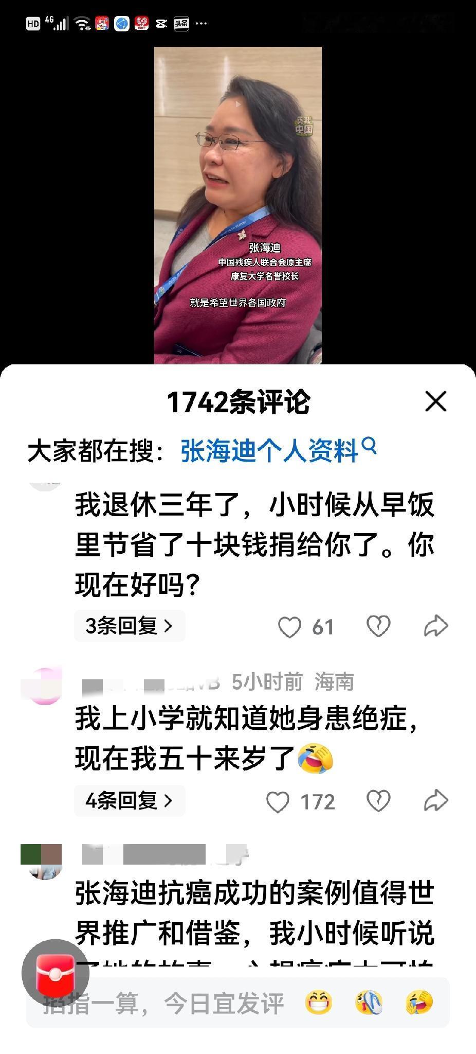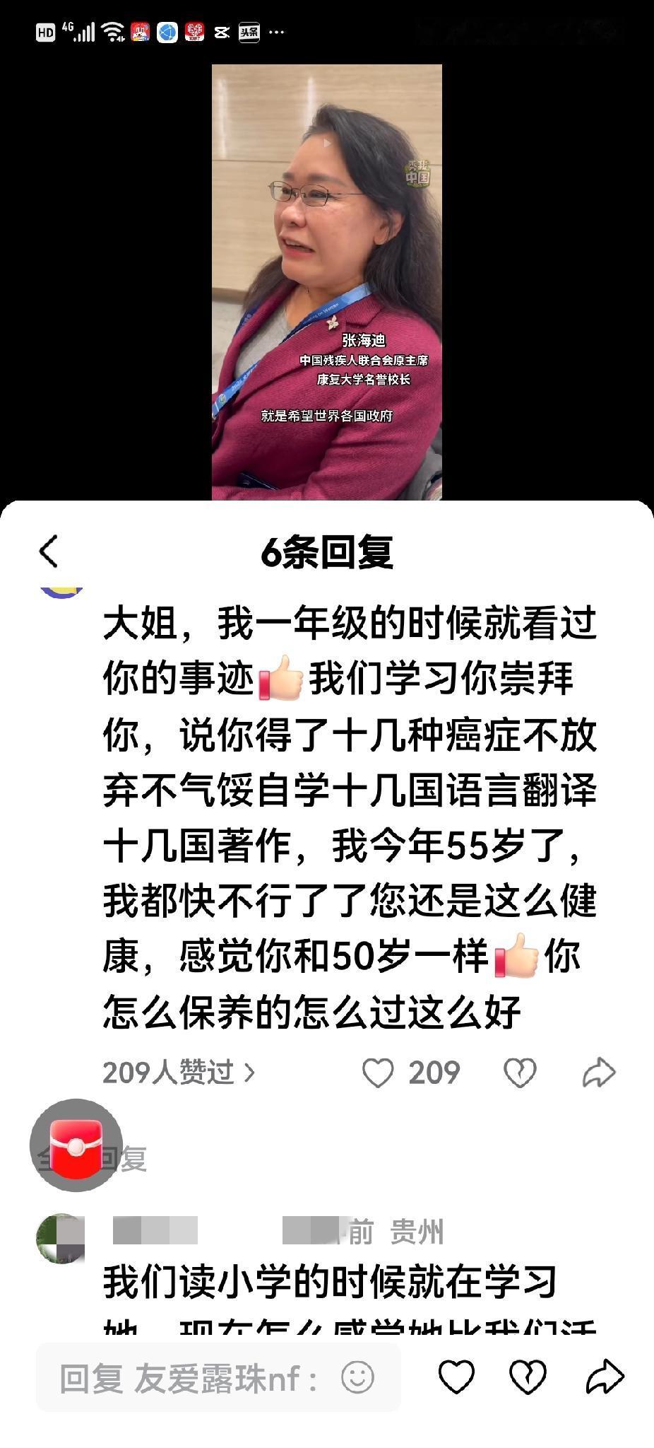 张海迪姐姐,打小就学习您勇斗病魔、不屈不挠、坚持学习的事迹,现如今,我已年过半百,没想到您风采依旧,您战胜了病魔,真是可喜可贺啊!