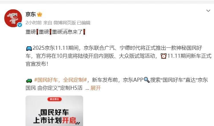 京东闷声干大事,“年轻人的第一辆车”真的来了! 2025年双十一期间,京东汽车联合广汽集团与宁德时代旗下时代电服,共同推出一款主打“国民好车”概念的新能源汽车,并在京东平台独家销售。 此次合作并非京东直接造车,而是发挥各自优势:广汽主导整车智能制造,宁德时代提供先进的电池技术及其创新的“巧克力”换电生态,京东则依托其庞大的用户洞察力和覆盖“买、配、养、用、换”的全渠道汽车消费服务平台角色。新车旨在聚焦外形时尚、性能安全、续航能力与价格亲民四大核心点,力求满足90%以上的日常生活通勤需求。 此次合作的一大亮点在于尝试革新汽车消费模式。 它推出了“一站配齐”的新理念,消费者不仅可在线上灵活选配“车衣定制版、车品配装版、养护加持版”等多种套餐,还能体验到京东旨在实现的“让买车像买手机一样方便”的线上定制、线下快提流程。 京东此时入局,显然不是要造一辆车,而是试图以用户需求为核心,重构汽车消费链条。 这标志着电商平台正利用其用户数据和渠道优势,深度融合产业链上下游,试图在竞争日益激烈的新能源汽车市场中,开辟一条以用户需求和消费体验为导向的新路径。