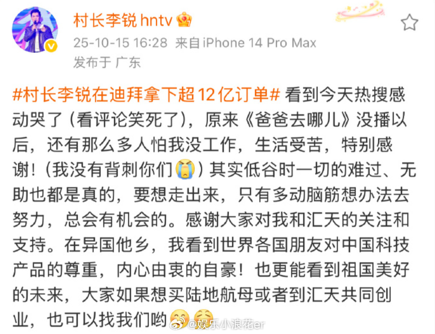 李锐回应在迪拜拿下超12亿订单李锐我没有背刺你们15日,村长李锐在迪拜拿下超