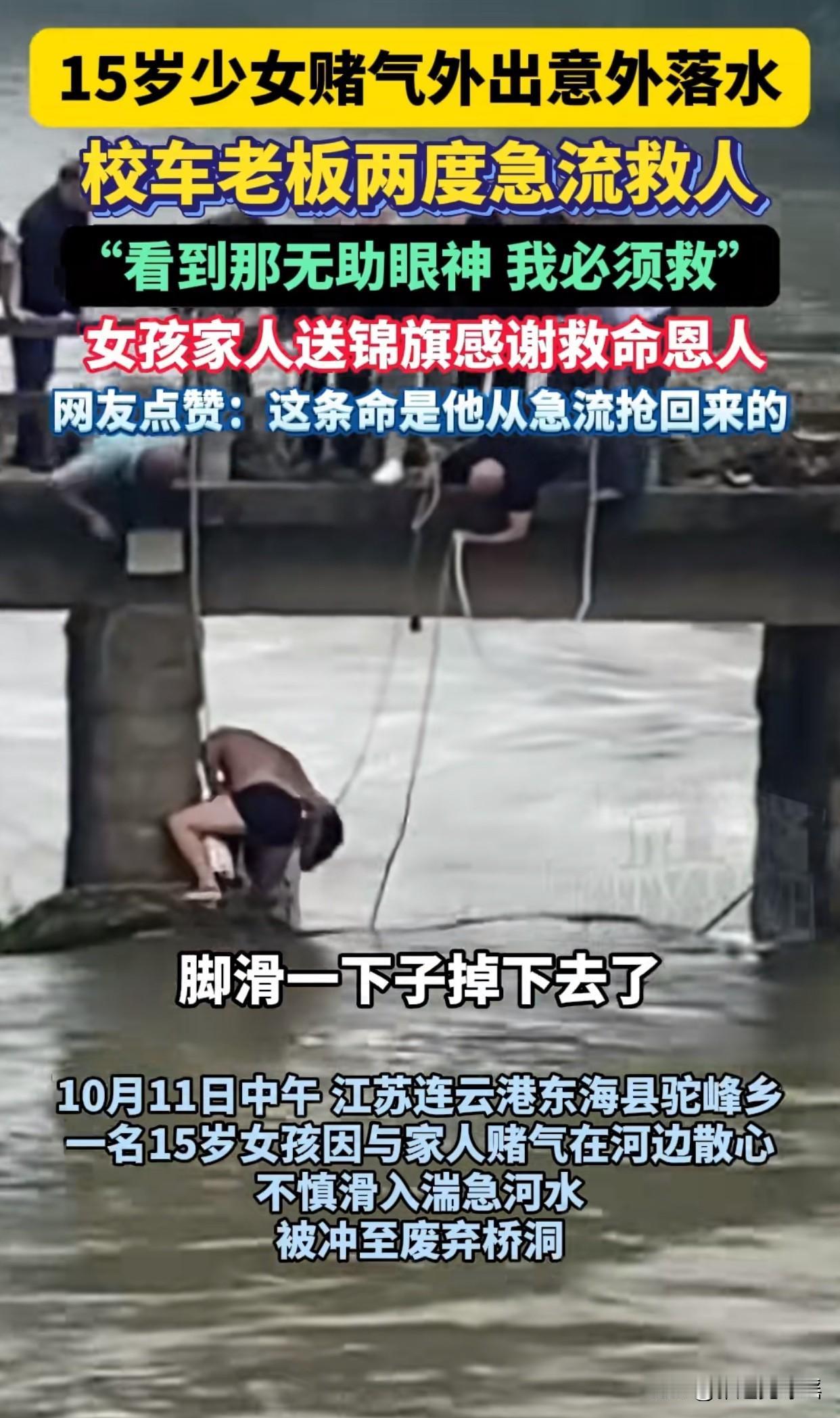 “太惊险了!”江苏连云港一15岁女孩跟家人闹别扭跑到河边,不小心掉进急流,校车司机刘师傅三次下水救人的事,真的让人揪心又感动。 说实话,那水流得多猛啊?刘师傅第一次跳下去直接被冲走,第二次拼命游也只抓到桥墩,身上被刮得全是伤。但他硬是爬回桥上拦车求助,最后和村民一起把女孩托上岸。完事后他哑着嗓子说“孩子们还在等我”,转头就开车去接学生了。 要我说,这根本不是普通的救人,这是一个普通人拼上性命在守护陌生生命。刘师傅让我明白:英雄也会害怕,但害怕时依然选择往前冲,这才是真勇敢。 我想到一个词叫“责任圈”,有些人只做好分内事,但总有人愿意把陌生人的安危也揽进自己责任里。当善良变成一种本能,危险时刻才会不加思考地出手。你们说是不是?