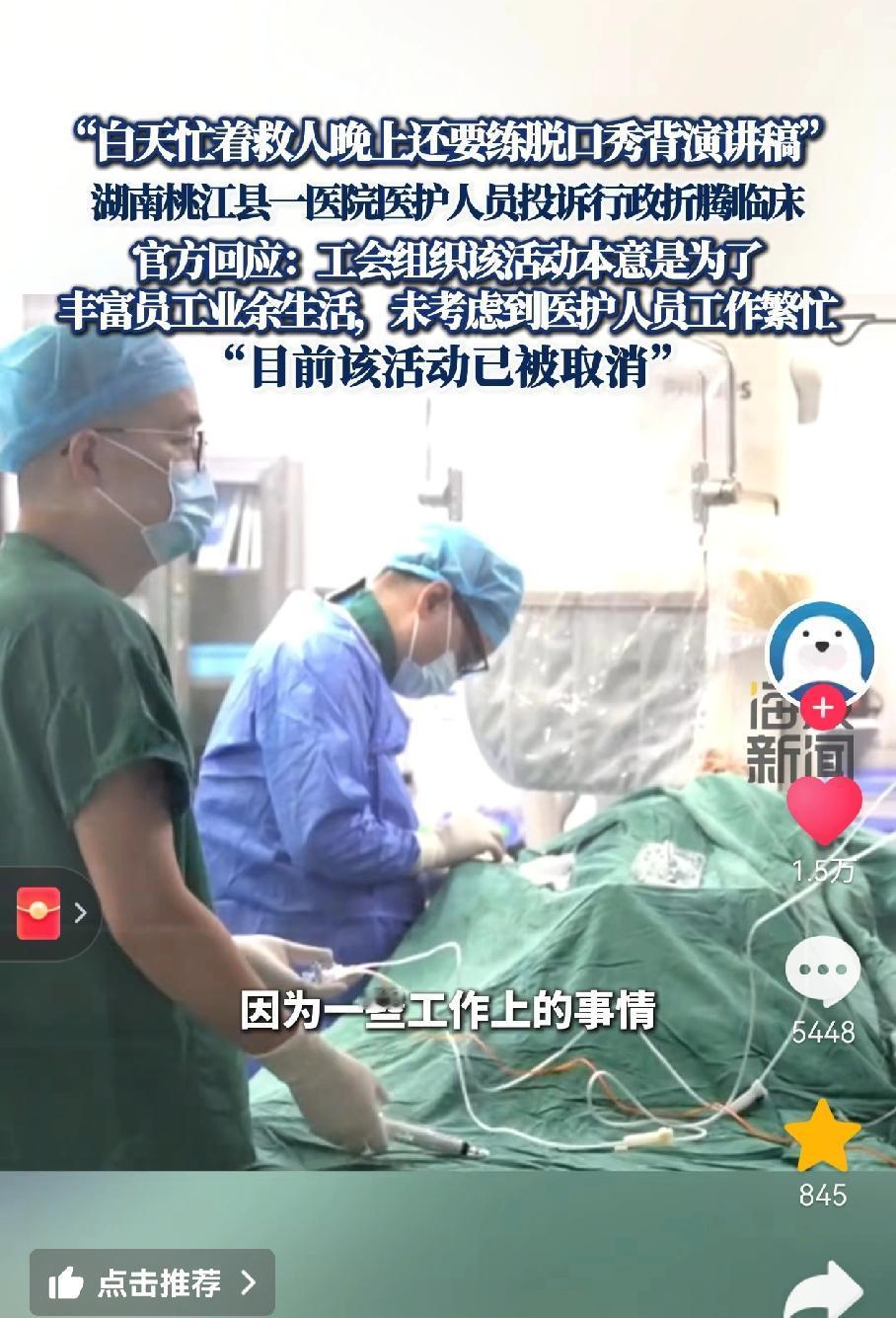 白岩松说的真应验了 他说他有一个愿望:“把医生的时间给医生、让他们专注于本职工作”。这句话的含金量现在体现出来了。 湖南桃江县一医院医护人员,投诉行政部门搞的活动折腾人,本来白天治病救人就很累,晚上还要背脱口秀演讲稿,纯属折腾临床医生。 随后官方回应说:工会组织该活动本意是为了丰富员工业余生活,但是没有考虑到医生工作辛苦,所以取消了这个活动。 医院不知道医生多忙?我肯定是不信,只希望这个举报者以后能顺利工作。