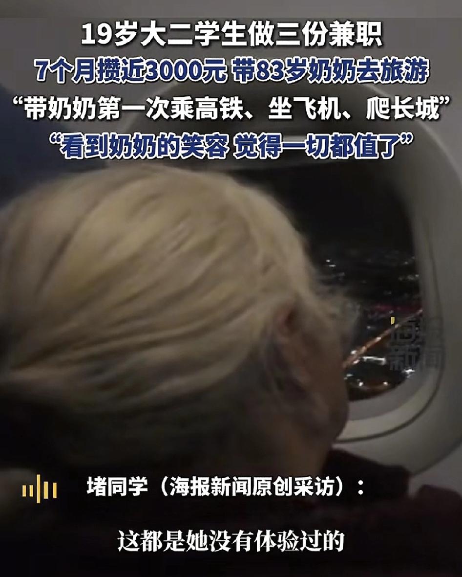 10月15日,河南安阳,一位19岁的大二男生分校的姿势带着83岁的奶奶乘坐高铁,坐飞机,爬长城的视频。男生说自己做三份兼职,7个月涨了3000块钱,平时做外卖都是一块钱一块钱存下来的,男生说自己做了一件人生中非常有毅力的事情。可以看出他与奶奶的感情非常深厚,这些都是用钱换不回来的。