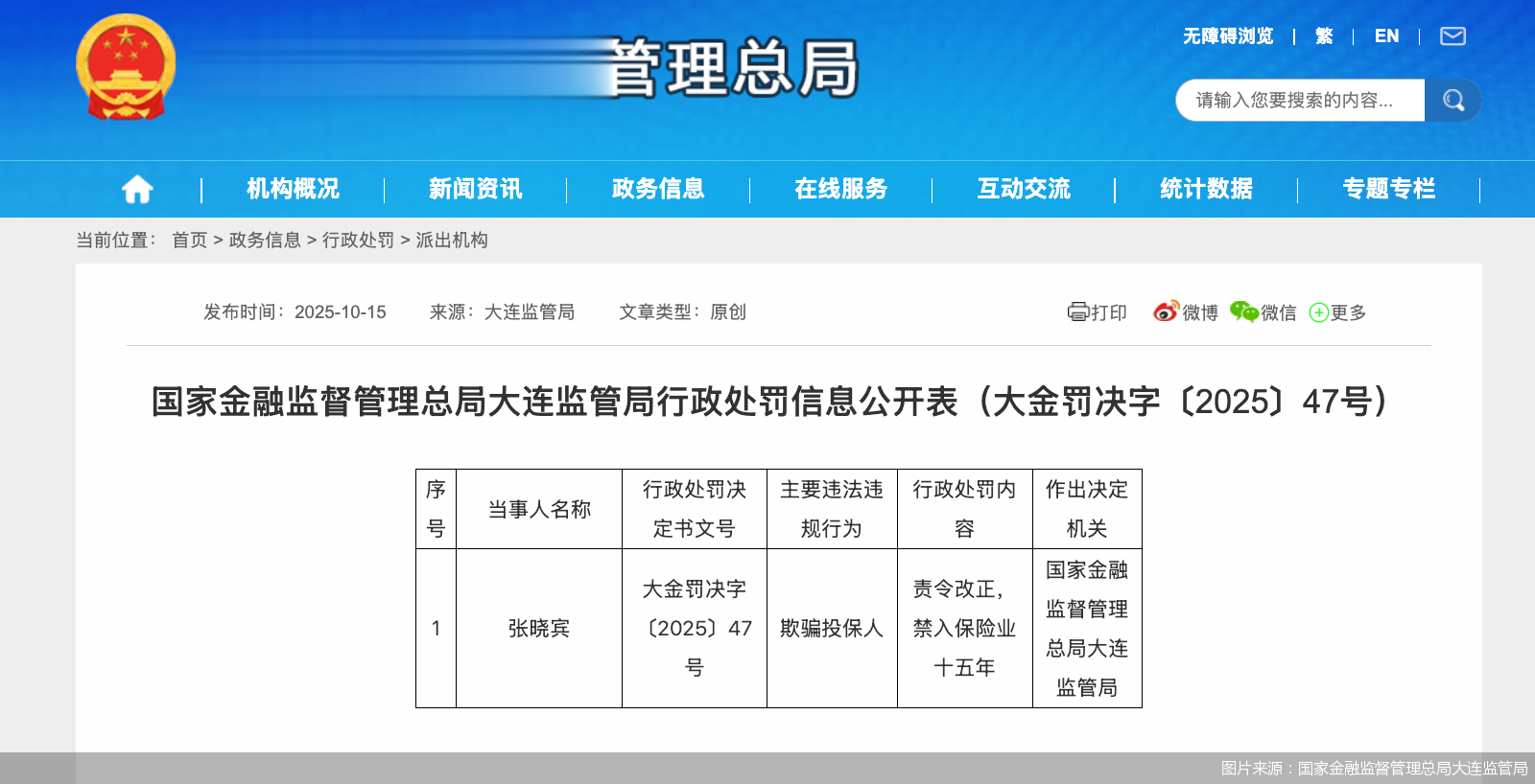 北京商报讯(记者胡永新)10月15日,国家金融监督管理总局大连监管局发布的行政处罚信息显示,张晓宾因欺骗投保人责令改正,禁入保险业十五年。