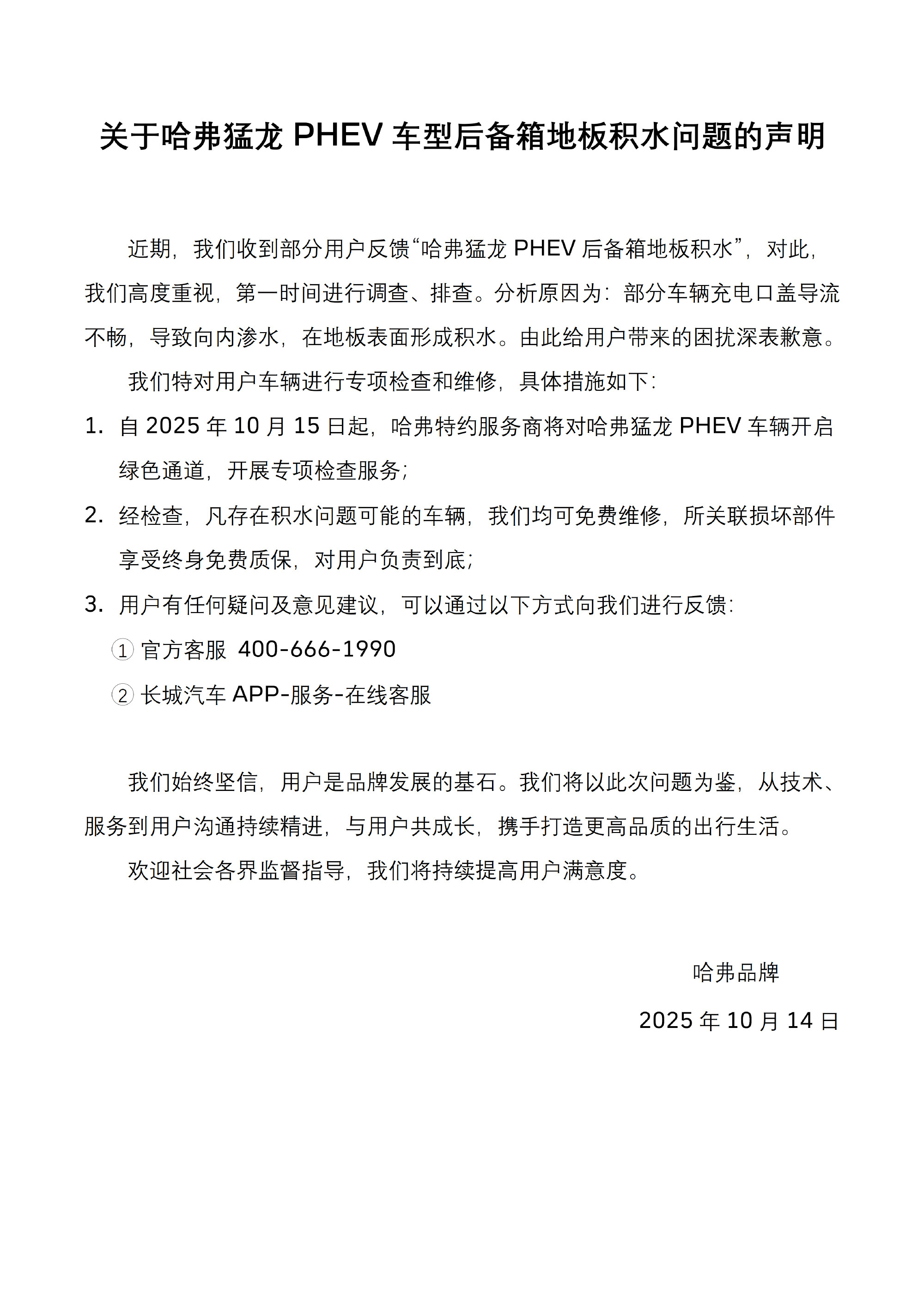 哈弗猛龙声明 哈弗品牌就猛龙PHEV车型后备箱地板积水问题发布声明 ——提供免费检修及终身质保