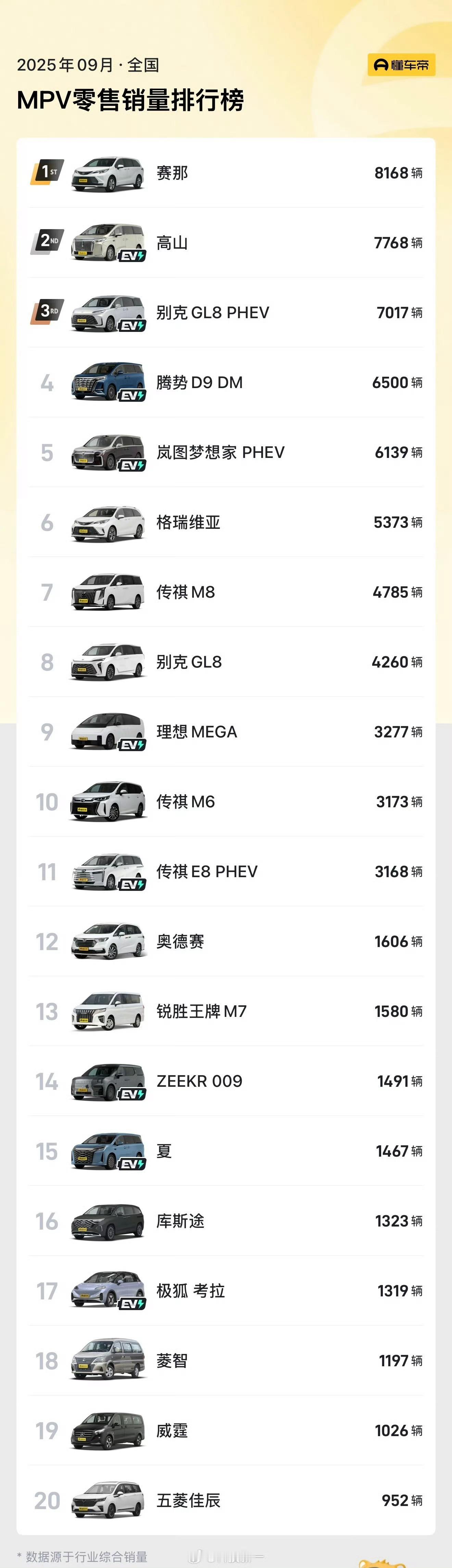 3️⃣GL8是合资品牌里反应最快的MPV,率先推出PHEV,加上Top 8油版,GL8全车系有11277台,仅次于赛那和格瑞维亚,强不强?