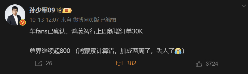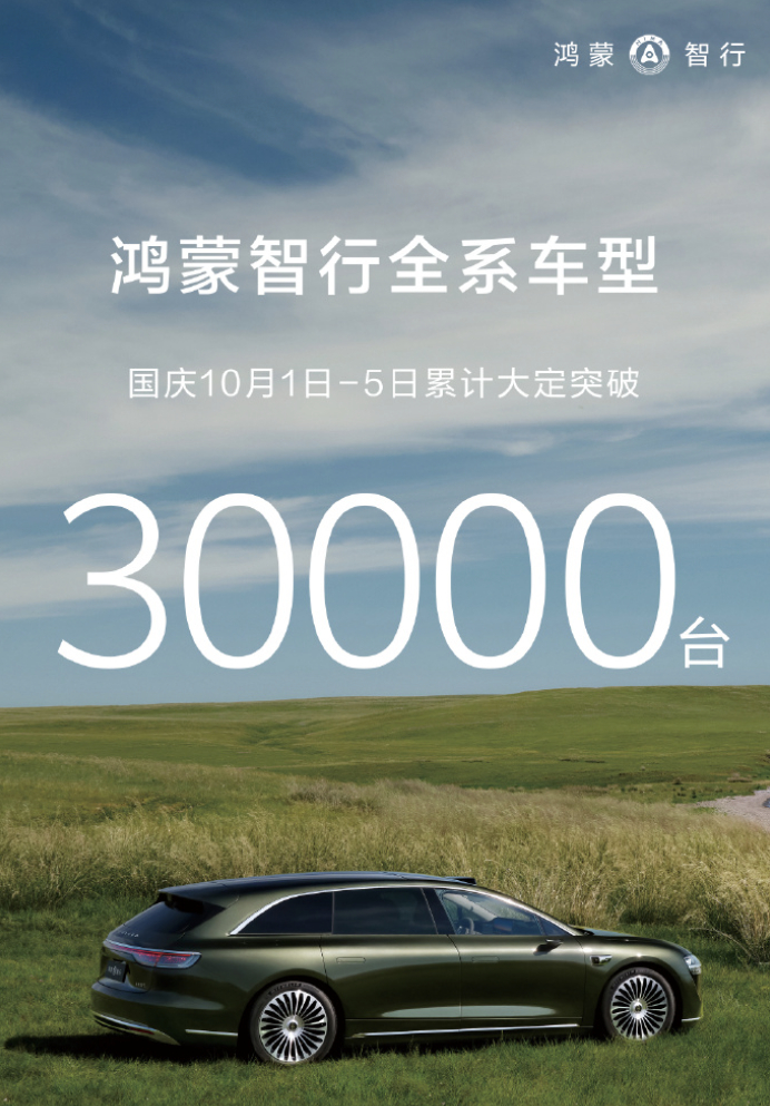 今天已经是月中了,包含国庆假期已经过去了两周,据军哥的消息来看,鸿蒙智行上周订单量是3万,加上国庆前五天的三万,就如此粗略计算,本月订单就已经超过六万,精算的话只多不少。
